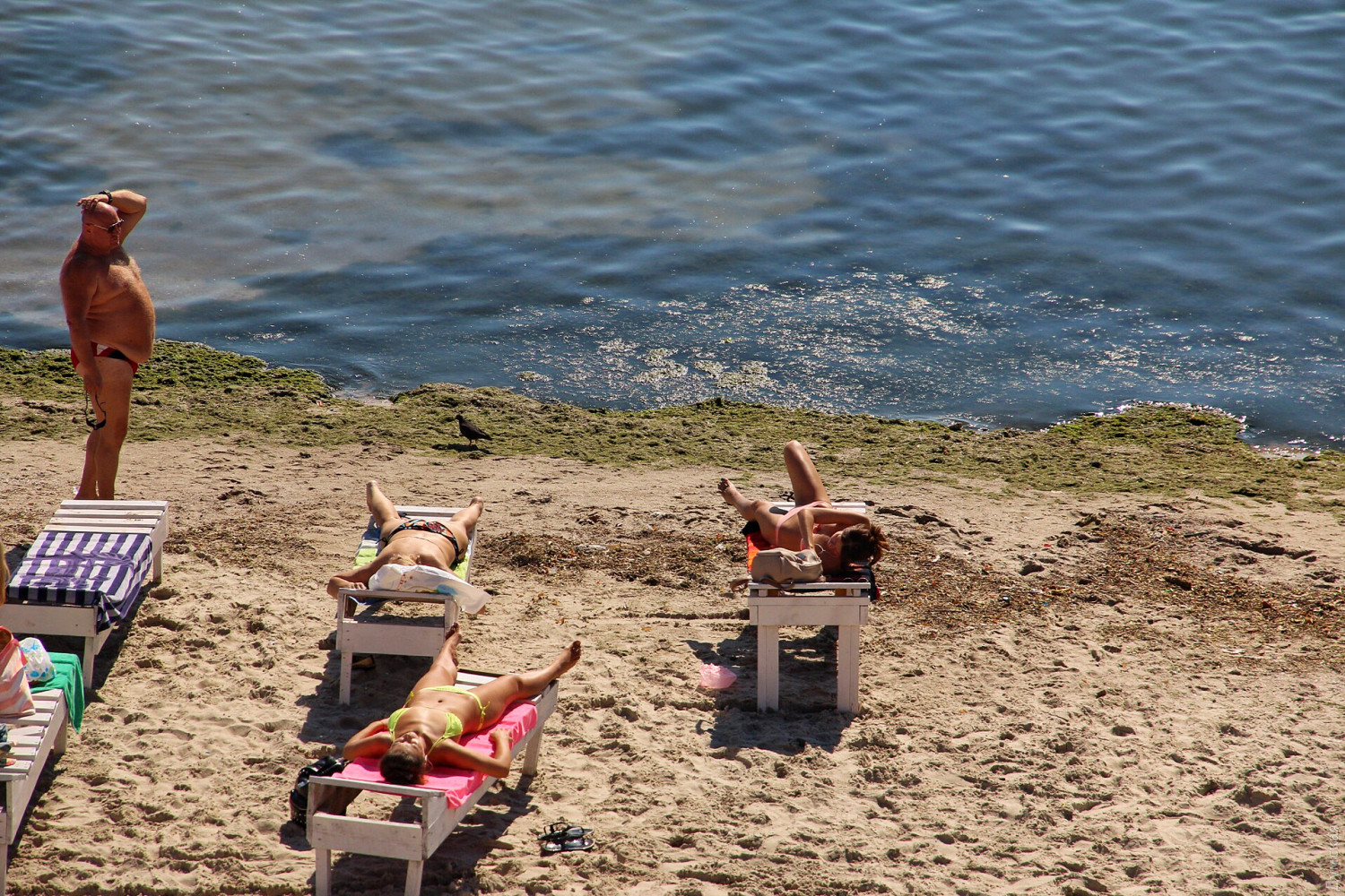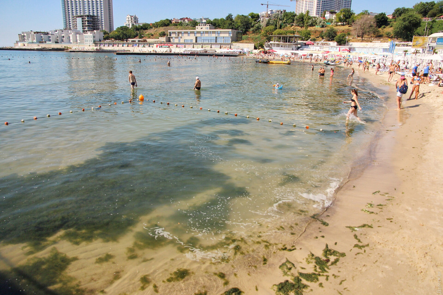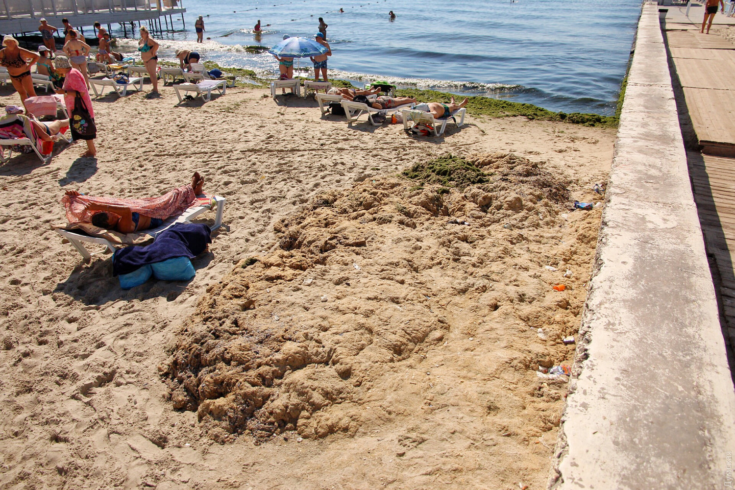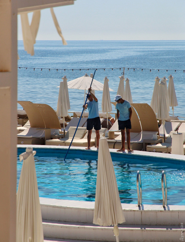 Сотрудники «Аркадия-Сити» приводят в порядок аллею. Заканчивают очищать пляжи и арендаторы, но только платную часть: к примеру, на бесплатной части «Итаки» гниет огромная куча водорослей недельной давности, а в прибрежной полосе колышется каша из нечистот, смытых вчерашним ливнем.