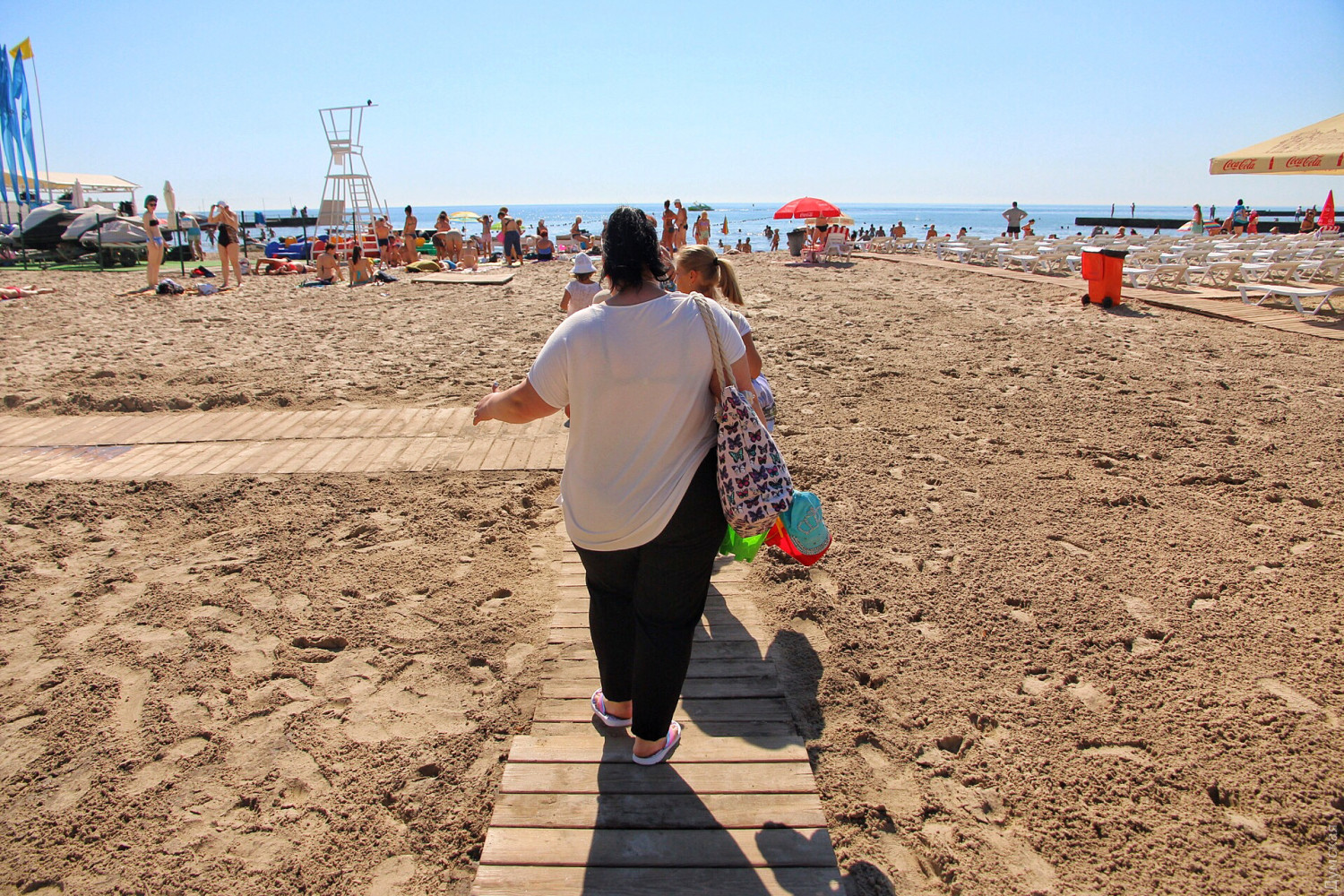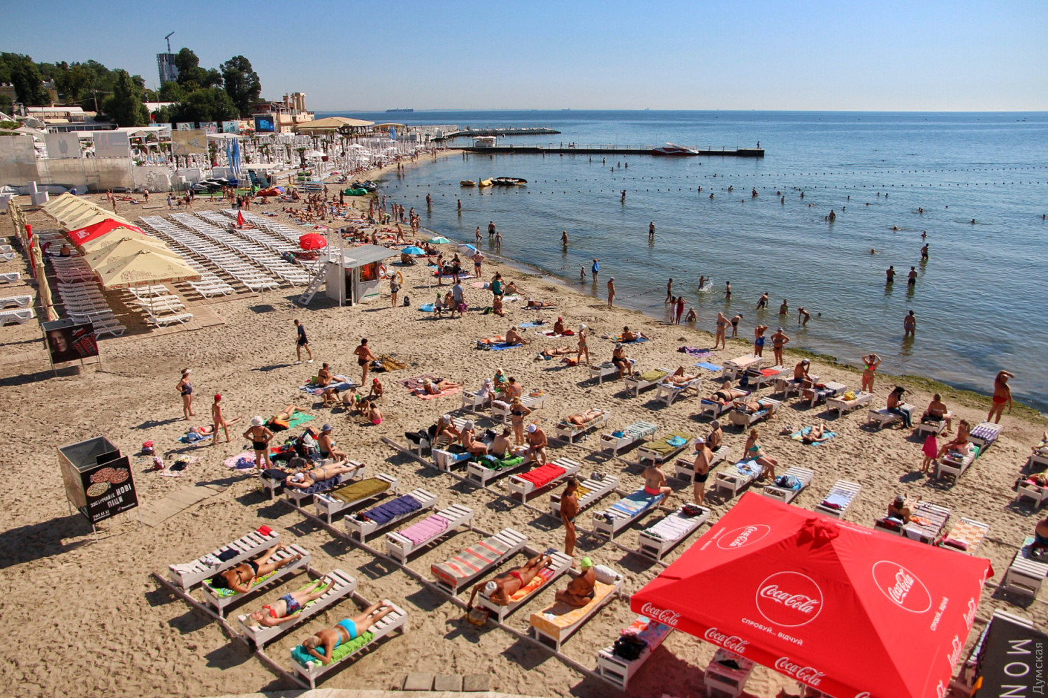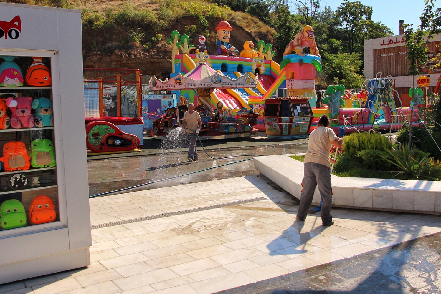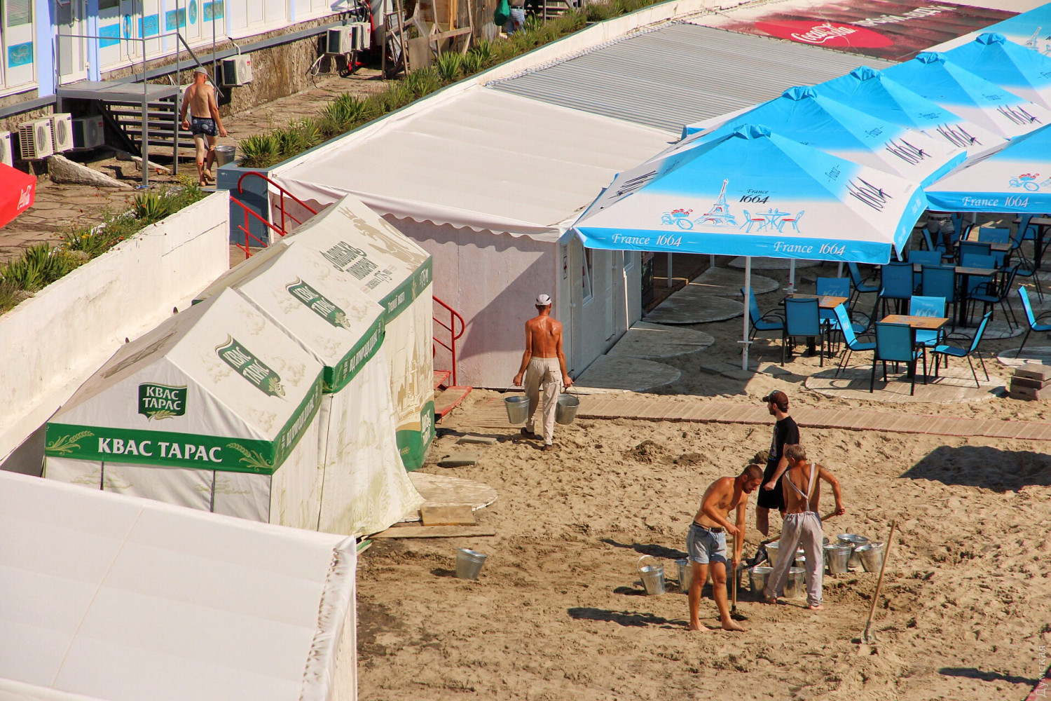 Сотрудники «Аркадия-Сити» приводят в порядок аллею. Заканчивают очищать пляжи и арендаторы, но только платную часть: к примеру, на бесплатной части «Итаки» гниет огромная куча водорослей недельной давности, а в прибрежной полосе колышется каша из нечистот, смытых вчерашним ливнем.