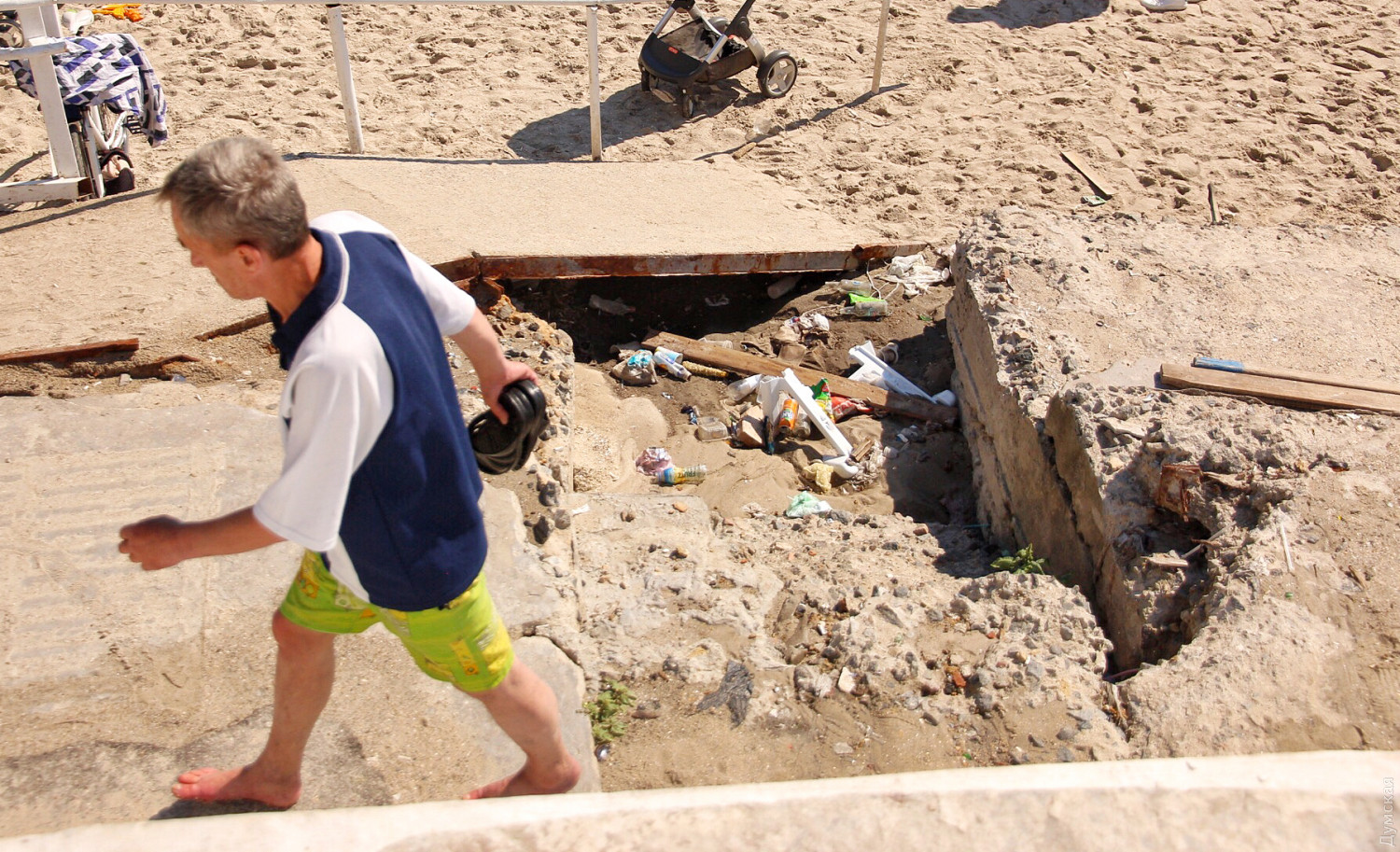 Он в очередной раз убедился в беспечности одесситов. Морская вода мутная, с большим количеством мусора, но это не мешает любителям водных процедур окунаться самим и разрешать плавать маленьким детям.