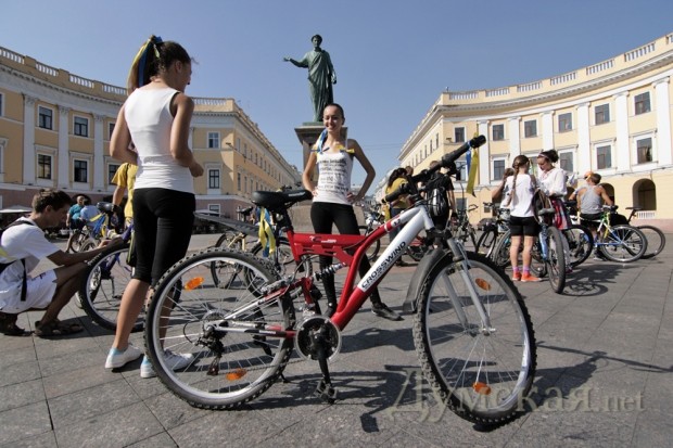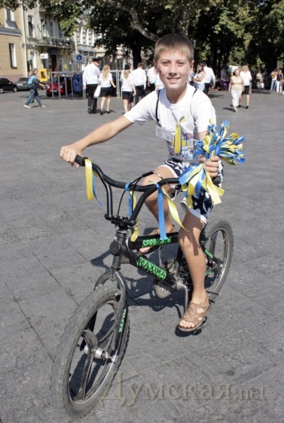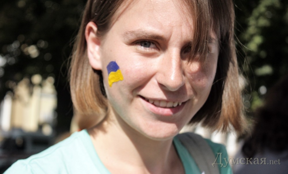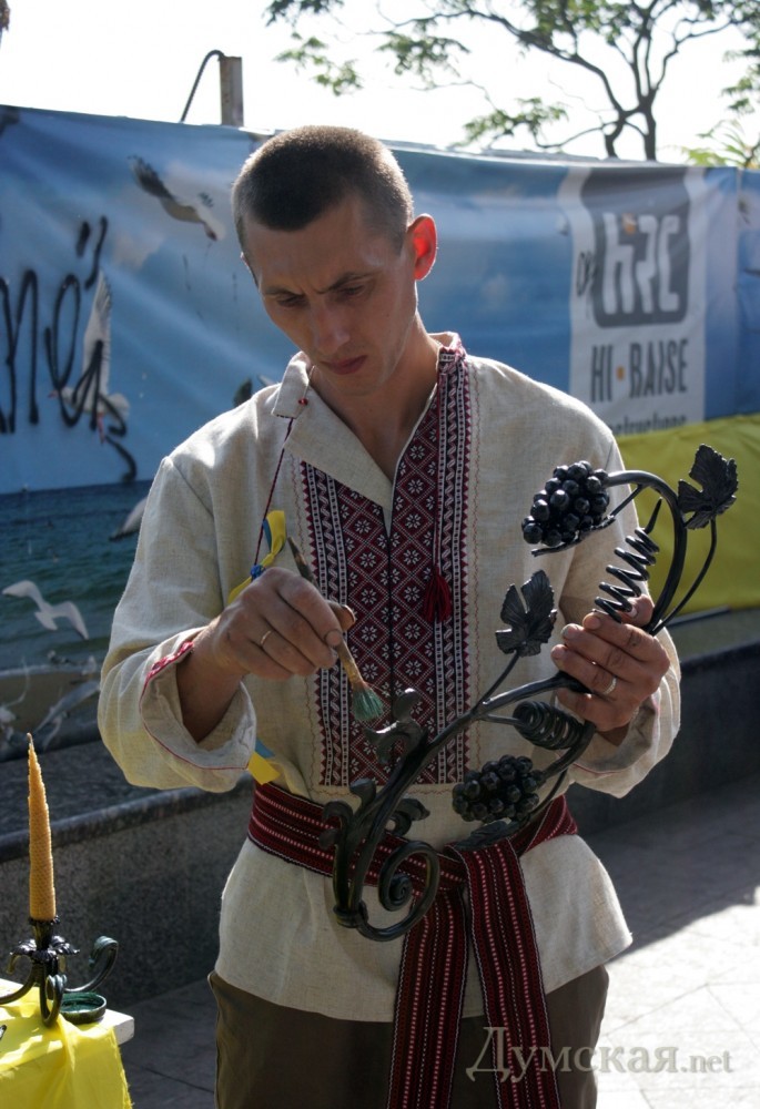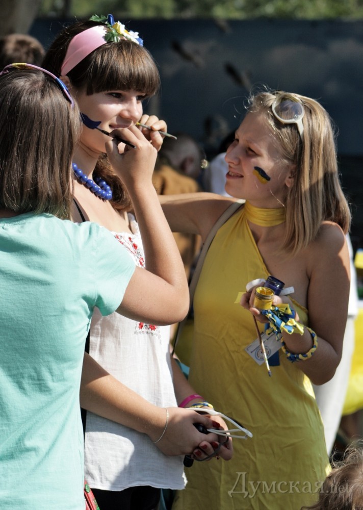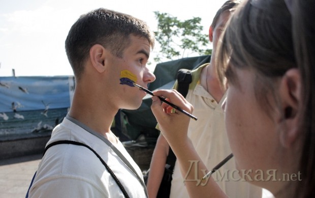 На Приморском бульваре постоянно работают и художники боди-арта. Всех желающих они разрисовывают национальными орнаментами и символами цвета государственного флага. Прохожим раздают сине-желтые ленточки.