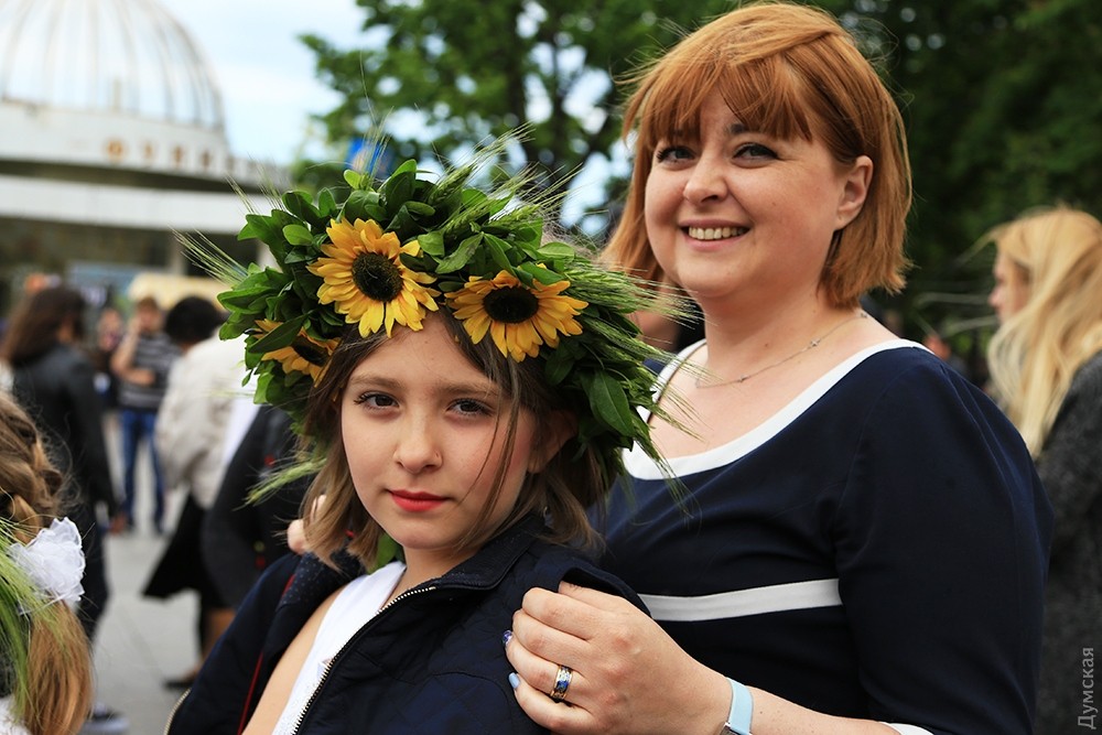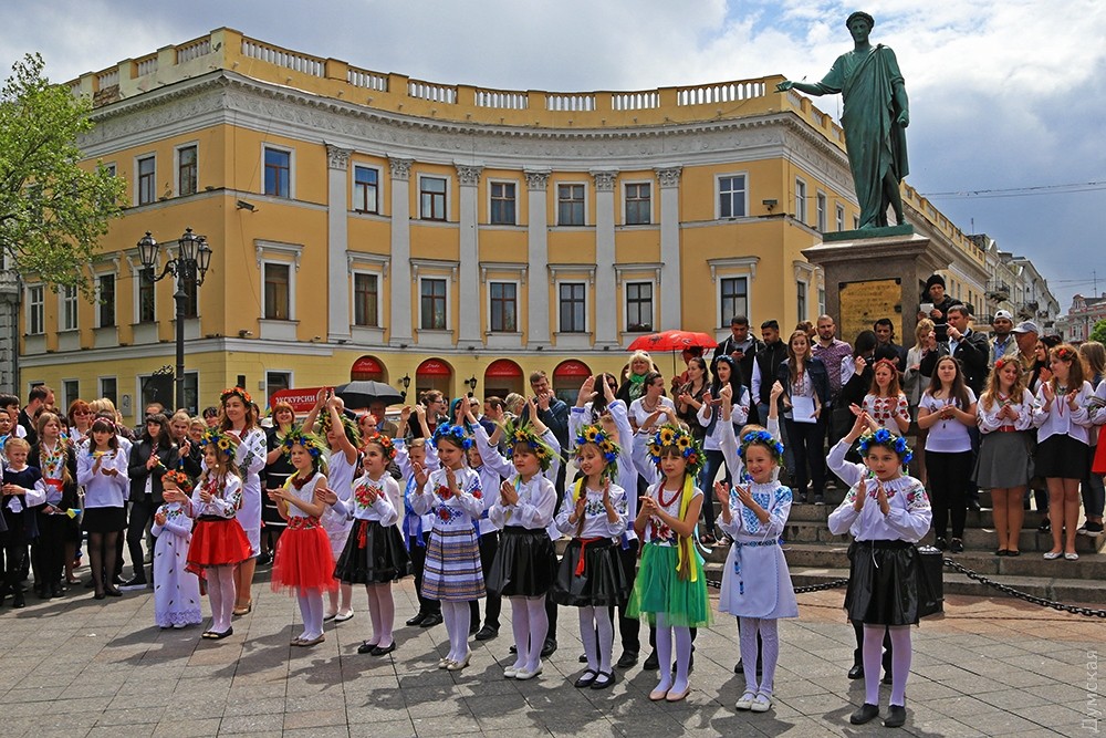 Сегодня возле памятника Дюку юные патриоты устроили акцию, посвященную национальному костюму украинцев — вышитой сорочке.