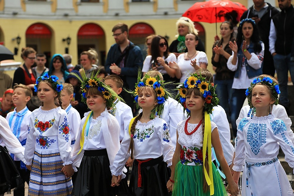 Несколько десятков детей, одетых в национальные украинские костюмы, исполнили украинский танец, а затем юные модели провели показ мод - в вышиванках, само собой.