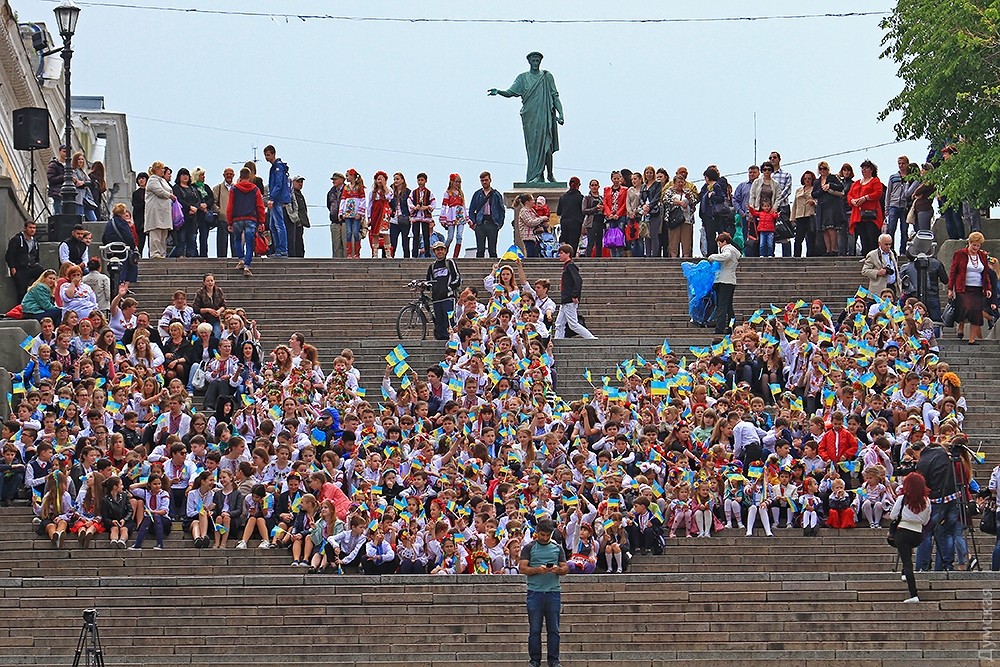 После участники акции выстроились на Потемкинской лестнице в огромный трезубец. У каждого в руках был небольшой флаг Украины, дети размахивали ими, создавая впечатление, будто герб колышется на ветру.