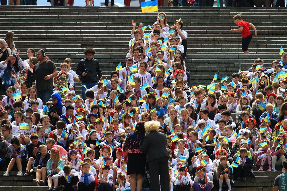 Флэшмоб в вышиванках: на Потемкинской юные патриоты выстроились в национальный герб