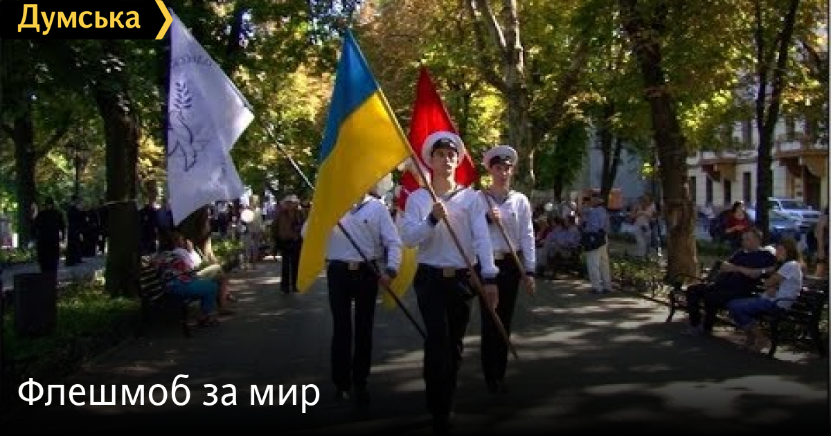 Флешмоб у Дюка. На Потемкинской лестнице курсанты морских училищ выстроились на средней площадке таким образом, чтобы сверху можно было прочесть слово МИР.