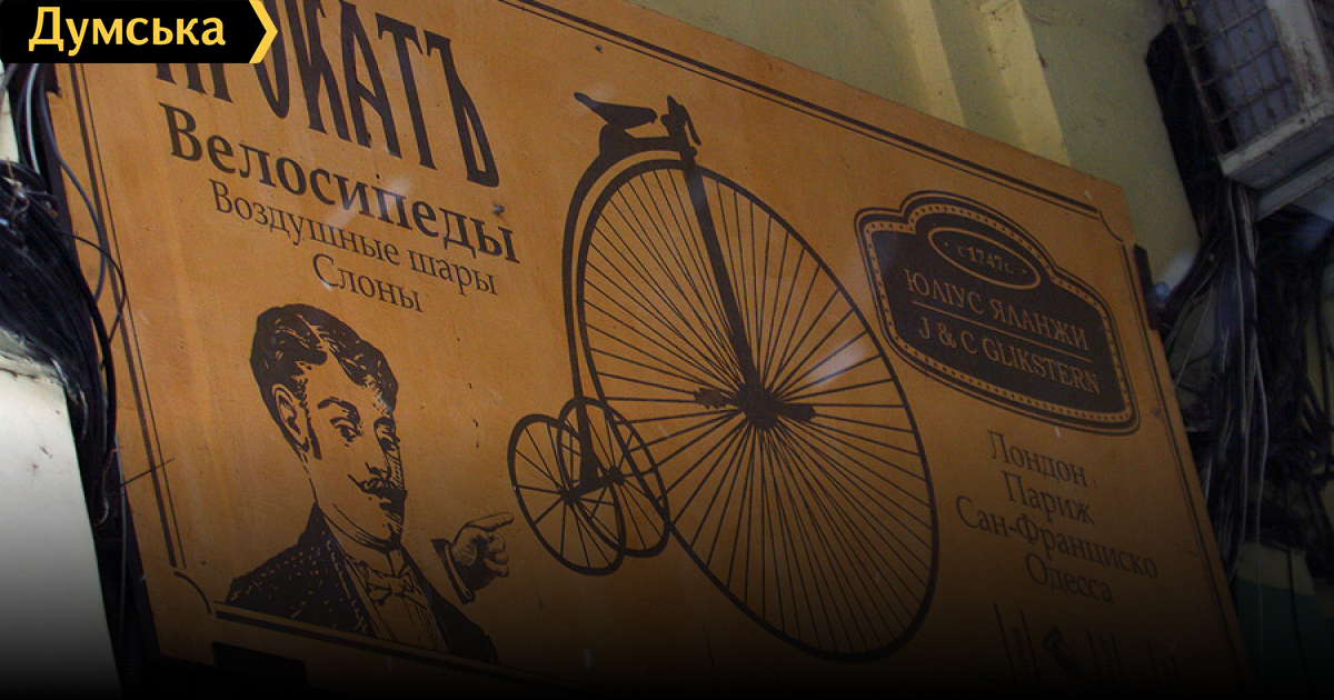 В арке, отделяющей Пале-Рояль от Екатерининской, напротив исторической рекламной фрески магазина велосипедов и автомобилей знаменитого летчика и спортсмена Сергея Уточкина, которую закрасили в 2012 году, появился шуточный рекламный щит, стилизованный под старину. Дамам и господам предлагают прокатиться на велосипедах, воздушных шарах и слонах всего за 1 царский рубль в час.