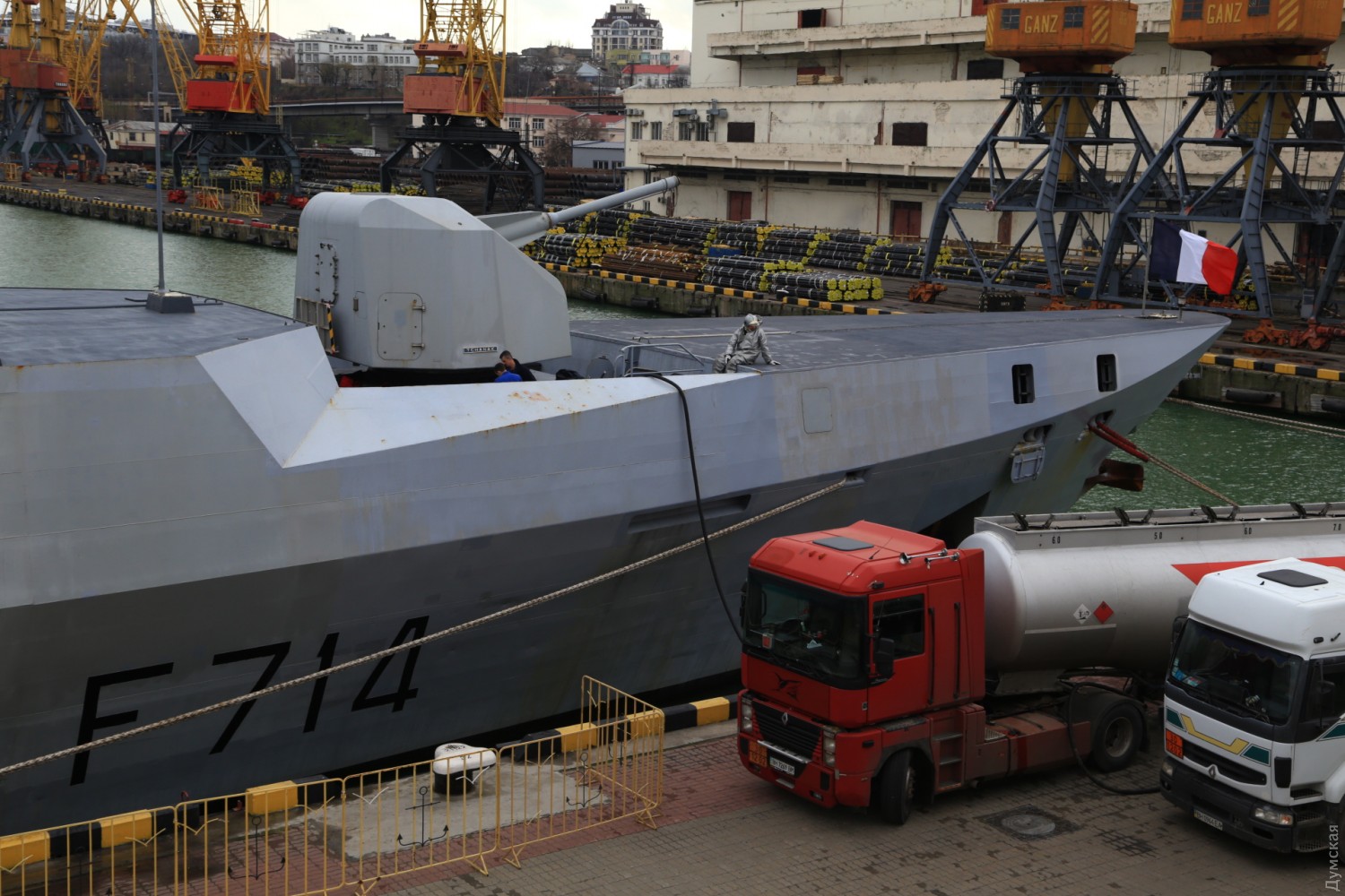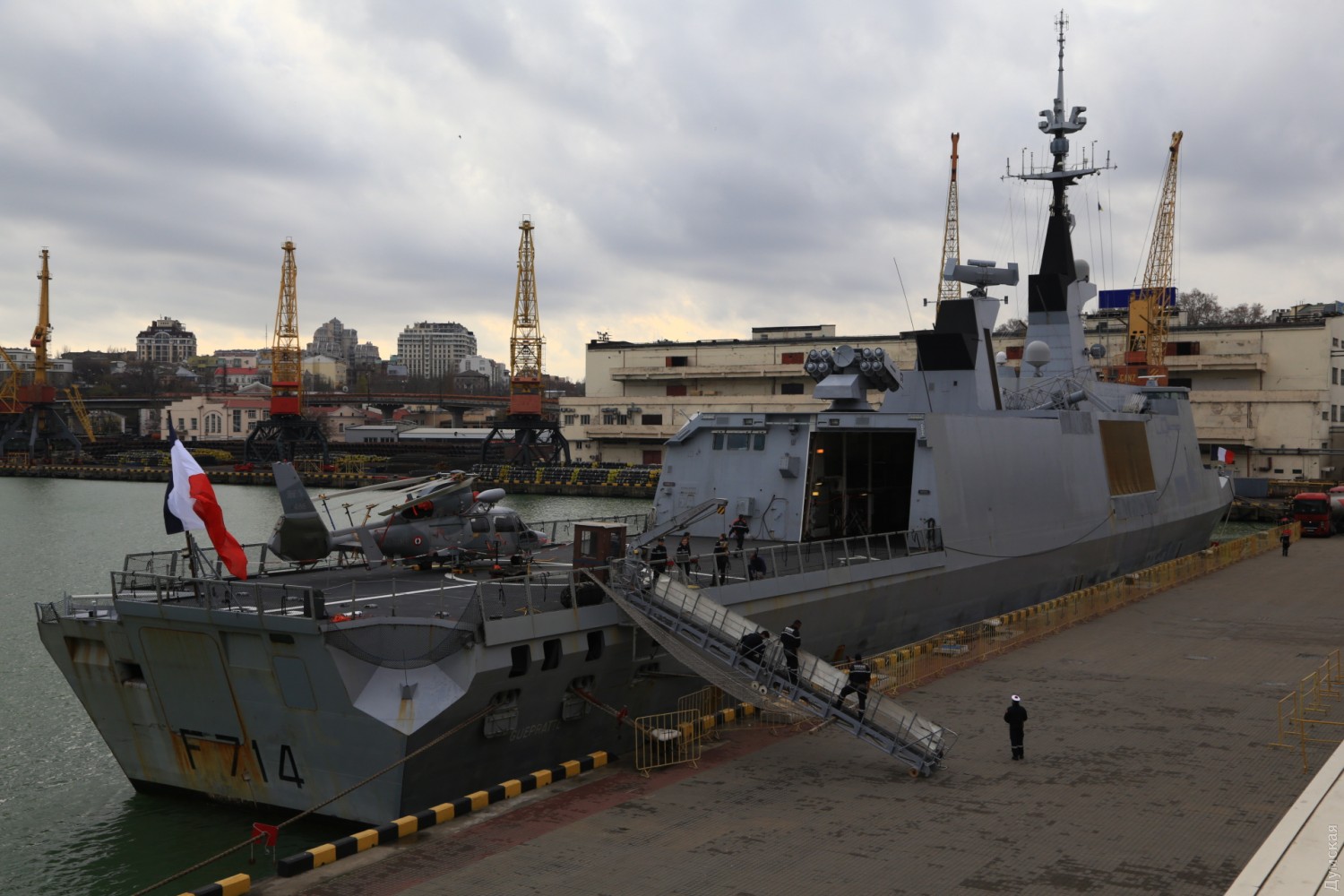 Французский фрегат-«невидимка» присоединился к американскому эсминцу в одесском портуСегодня утром, примерно в 9:00, в одесский порт зашел французский фрегат FS Guеpratte (F 714). Его пришвартовали у 15 причала морвокзала. Рядышком, у 16 причала, со вчерашнего дня стоит американский эсминец. И если янки из-за шторма опоздали на сутки, то французы пришли часов на шесть раньше, чем обещали. «Гепрат» относится к новейшим французским фрегатам типа «Лафайет». Специальное покрытие корпуса, форма и углы наклона надстроек придают ему невидимость для радаров. Фрегат обладает широким спектром радиолокационного вооружения и несет восемь пусковых установок крылатых противокорабельных ракет Exocet MM40 block II и один зенитно-ракетный комплекс малой дальности Crotale CN2. Артиллерия включает 100-мм пушку и зенитные 20-мм автоматы. Фото — Сергей Смоленцев СМЕРТЬ РОСІЙСЬКИМ ОКУПАНТАМ! Помітили помилку? Виділяйте слова з помилкою та натискайте control-enter |