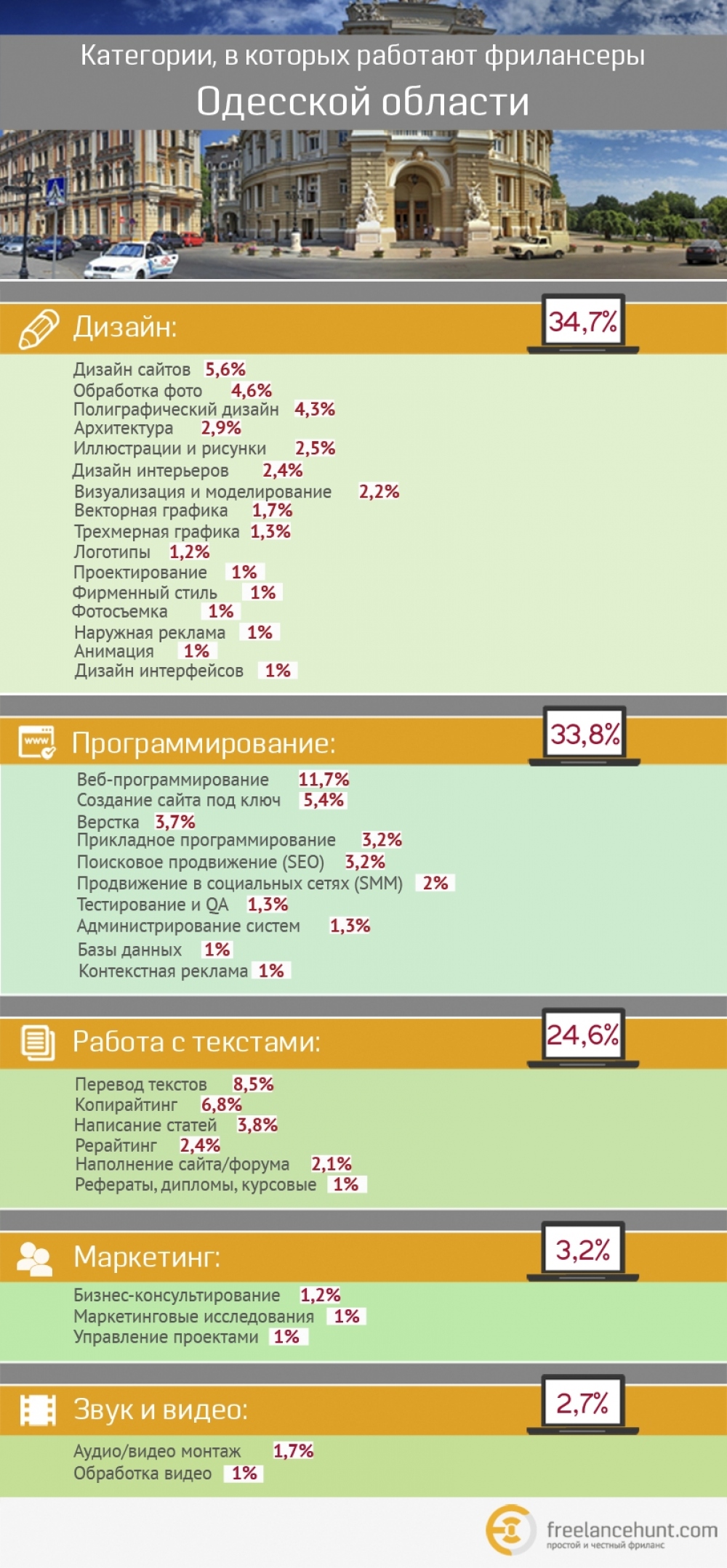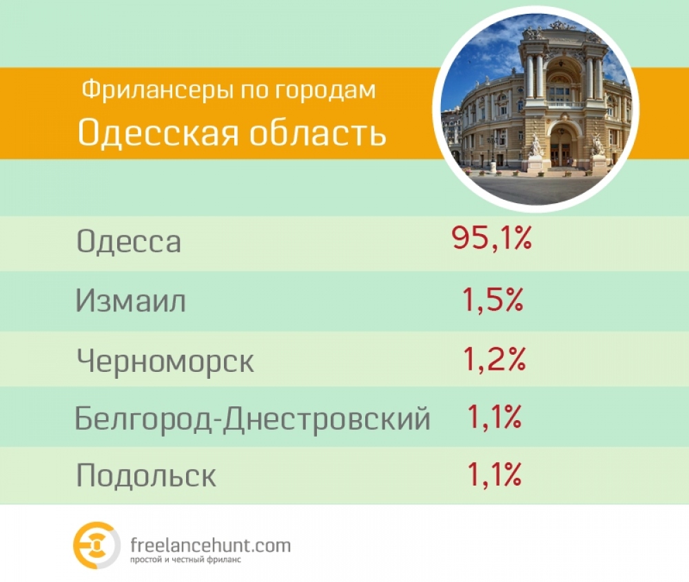 Фриланс в Одесской области — аналитика от Freelancehunt.com (на правах рекламы)Фриланс – набирающий популярность вид трудовой занятости, который подразумевает выполнение разовых заказов. Чаще всего фрилансеры работают удаленно, решая поставленные задачи через интернет. Встречаются заказчики и исполнители со всей страны на специализированных сервисах – фриланс-биржах. Ведущая украинская фриланс-площадка Freelancehunt проанализировала активность фрилансеров и заказчиков в Украине и Одесской области. Результат подчеркнул стремительный рост внутреннего фриланс-рынка в Украине – на Freelancehunt.com по итогам первого полугодия рост количества пользователей составил порядка 30% (сейчас на сервисе работает более 145 000 фрилансеров), а количество публикуемых ежедневно проектов по сравнению с аналогичным периодом прошлого года увеличилось в два раза. Фрилансеры и заказчики В Одесской области проживает 5,7% фрилансеров страны и 8,9% заказчиков. Таким образом, по количеству фрилансеров и заказчиков область находится на четвертом месте по Украине. Так как фриланс подразумевает удаленное сотрудничество, фрилансеры выполняют задачи для заказчиков со всей страны. Это же можно сказать и о местных заказчиках – они работают как с местными фрилансерами, так и с фрилансерами из других регионов. Фрилансеры в области Средний возраст фрилансера – 27 лет, что соответствует показателю среднего возраста по стране (26 лет). Ожидаемо, наибольшее количество фрилансеров живут в центре области – в Одессе. Тут проживает 95,1% исполнителей. Другие города, в которых работают исполнители: Измаил – 1,5%, Черноморск – 1,2%, Белгород-Днестровский – 1,1%, Подольск — 1,1%. Навыки Также были проанализированы опубликованные заказчиками задачи за последние полгода. Спрос на услуги фрилансеров сформировался следующим образом: Можно ожидать, что фриланс продолжит укреплять свои позиции в Украине, будет содействовать трудовой занятости, рациональному распределению бюджета компаний и сокращения расходов бизнеса. Одесская область вносит в этот рост весомый вклад. СМЕРТЬ РОСІЙСЬКИМ ОКУПАНТАМ! Помітили помилку? Виділяйте слова з помилкою та натискайте control-enter |