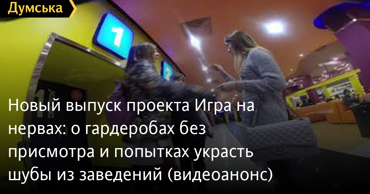 Новый выпуск проекта «Игра на нервах»: о гардеробах без присмотра и попытках украсть шубы из заведений (видеоанонс)В следующий понедельник на канале «ДумскаяТВ» смотрите новый выпуск программы «Игра на нервах». Ведущие Тамара Кирилюк и Анастасия Большедворова разыграли работников нескольких заведений города, изображая похищение верхней одежды в гардеробе. Начало программы в 21:30, 26 февраля. СМЕРТЬ РОССИЙСКИМ ОККУПАНТАМ! Заметили ошибку? Выделяйте слова с ошибкой и нажимайте control-enter Думская ТВ. Сюжеты:
