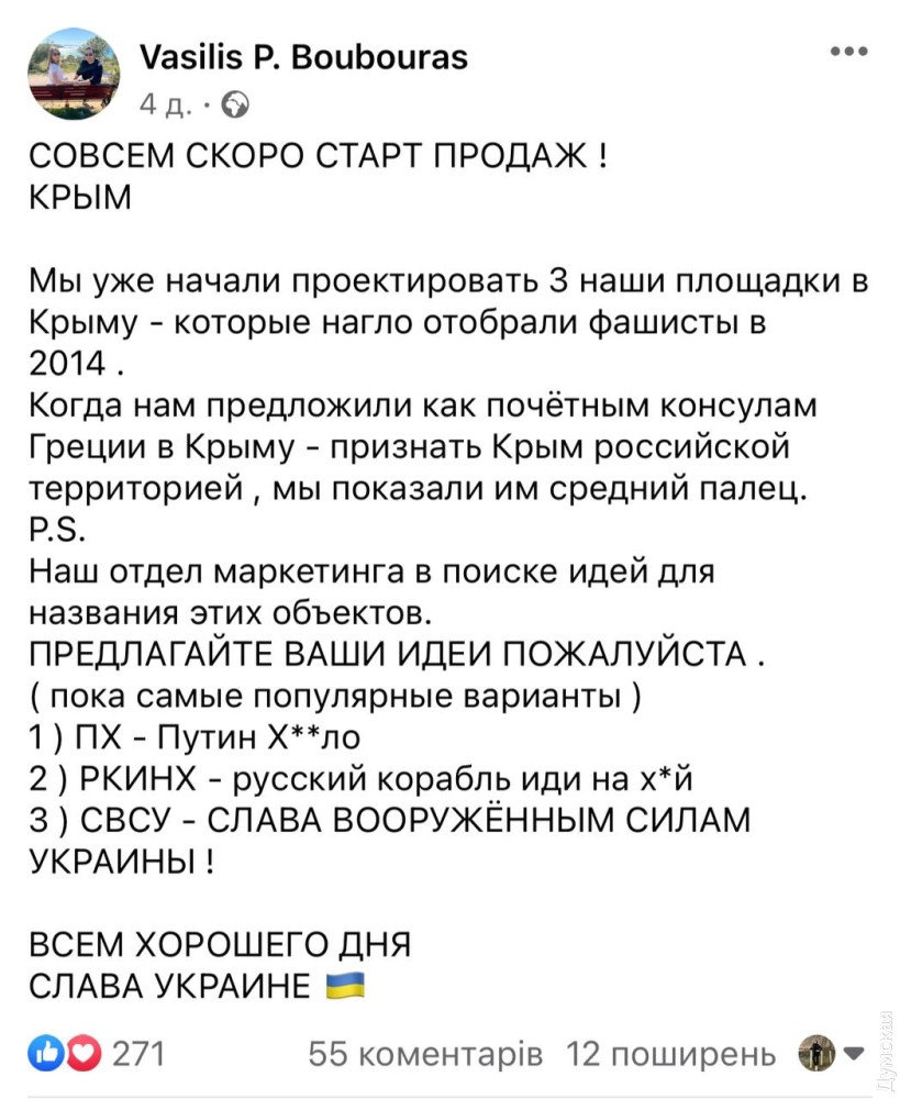Одеський забудовник відновлює роботу в Криму: найпопулярніша назва проекту «Путін Х*йло»Виконавчий директор одеської будівельної компанії Василіс Бумбурас заявив про відновлення роботи в Криму і швидкий старт продажів. За його словами, фірма вже почала проектувати три майданчики на тимчасово окупованому півострові. Відділ маркетингу фірми шукає назви для цих об'єктів і закликає всіх українців допомогти в цьому. Поки що трійка лідерів виглядає так: 1. ПХ - Путін Х*йло 2. РКИНХ — російський корабель йди на х*й 3. СВСУ — СЛАВА ЗБРОЙНИМ СИЛАМ УКРАЇНИ «Ми вже почали проєктувати три наші майданчики в Криму — які нахабно відібрали фашисти в 2014. Коли нам запропонували як почесним консулам Греції в Криму — визнати Крим російською територією, ми показали їм середній палець», — пояснює позицію компанії «Гефест» Василіс Бумбурас. СМЕРТЬ РОСІЙСЬКИМ ОКУПАНТАМ! Помітили помилку? Виділяйте слова з помилкою та натискайте control-enter |