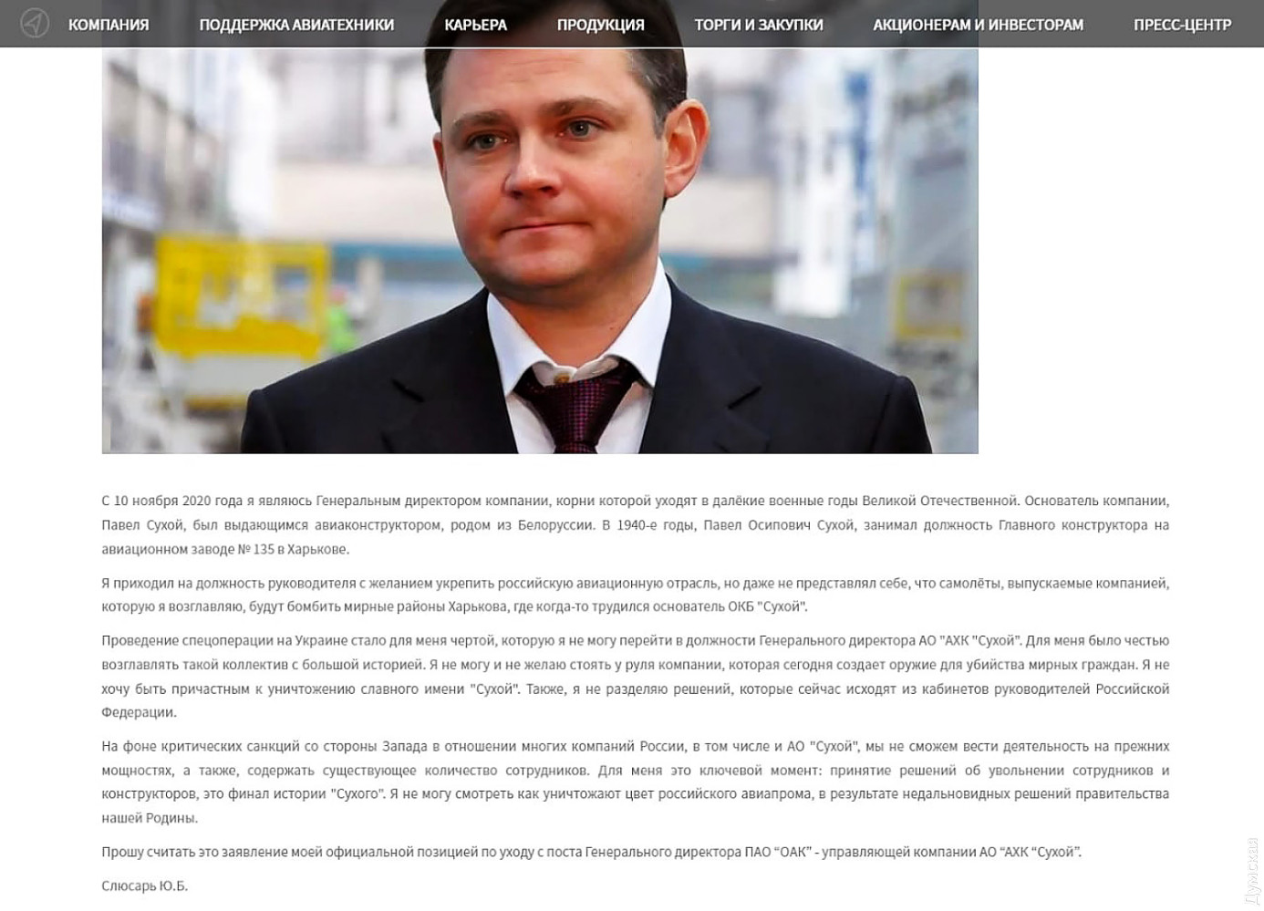 Гендиректор ведущей российской авиастроительной компании уволился из-за развязанной войны в УкраинеГенеральный директор ведущей авиастроительной компании российских нацистов АО «АХК «Сухой» Юрий Слюсарь, которая производит военные самолеты, уволился из-за развязанной войны против Украины. Об этом он сообщил на странице официального сайта компании. «Я не могу и не желаю стоять у руля компании, которая сегодня создает оружие для убийства мирных граждан. Я не хочу быть причастным к уничтожению славного имени Сухой. Также я не разделяю решений, которые сейчас исходят из кабинетов руководителей рф», — подытожил Слюсарь. Напомним, компания «Сухой» — крупнейший поставщик боевой авиации для вооруженных сил страны-агрессора. Здесь выпускают самолеты Су-24, Су-25, Су-27, Су-30, Су-34, которые сегодня уничтожают наши города и убивают мирных жителей. Компания была названа в честь советского авиаконструктора Павла Сухого. Первые истребители и бомбардировщики марки «Су» были разработаны 1939-1941 годах. Сейчас на предприятии работают более 20 тысяч человек. Интересно, что Слюсарь также занимал должность гендиректора «Объединенной авиастроительной корпорации» (АО «ОАК»), которая руководит всеми авиазаводами и закупками авиатехники в рф. По словам Слюсаря, над принятием этого решения он размышлял больше месяца. СМЕРТЬ РОСІЙСЬКИМ ОКУПАНТАМ! Помітили помилку? Виділяйте слова з помилкою та натискайте control-enter |