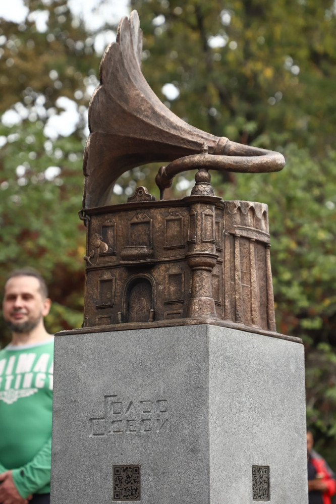 Скульптурная композиция представляет собой бронзовый старинный граммофон, четыре стороны которого – это фасады одесских домов со множеством уютных деталей одесских зданий и дворов, которые так милы одесситам.