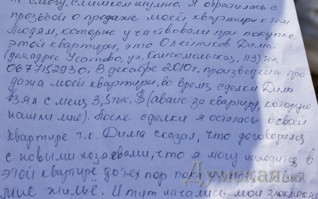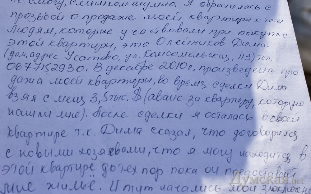 Дело было так. В декабре 2010 года Лариса Николаевна решила продать свою квартиру на Степовой улице, чтобы купить меньшую жилплощадь, а разницу в деньгах отдать дочери с внуком. Сделка состоялась, и пенсионерка получила полагающуюся ей сумму. Новые хозяева квартиры разрешили ей некоторое время пожить в проданной квартире — пока женщина не приобретет новое жилье. С тех пор и начались злоключения Ларисы Николаевны. За помощью в покупке недвижимости она обратилась к тому же человеку, который помог ей с продажей старой. Дмитрий Олейников не вызвал у Масуновой никаких подозрений, тем более, что женщине знала — он работает в правоохранительных органах. Дмитрий взял у пенсионерки аванс в размере 3,5 тысяч долларов на покупку новой квартиры. Впоследствии милиционер несколько раз увеличивал сумму аванса. Ничего не подозревая, Лариса Масунова отдала ему в общей сложности 15,5 тысяч долларов. Однако долгожданных квадратных метров она так и не получила. Вскоре новые владельцы квартиры на законных основаниях попросили женщину освободить квартиру. Лариса Николаевна отказалась. Был суд, который обязал пожилую одесситку освободить квартиру до 15 марта 2012 года. Сегодня женщину выставили на улицу силой. Ей стало плохо. В результате Масунова оказалась в больнице. Вот такая история. «Думской» удалось разыскать Дмитрия Олейника, которому женщина передавала деньги. Он признался, что действительно получал наличные, однако точную сумму назвать не смог. «В то время я был водителем и помощником риелтора, который занимался продажей и потом покупкой новой квартиры для Ларисы Николаевны, — рассказал нам Дмитрий. – Риелтор — Анжела Мякенькая не работала на агентство. Она несколько раз звонила Масуновой, говорила, какая сумма необходима. Деньги нужны были на строительство ее нового жилья. А приезжал за деньгами я, забирал их, и, не пересчитывая, отдавал Анжеле. Осенью я с Анжелой разругался и перестал с ней работать. С тех пор я ее не видел». Дмитрий добавил, что он уже 7 лет не работает в милиции. «Мне с журналистами нельзя общаться, потому что меня точно грохнет кто-то, — ответила на наш звонок риелтор Анжела Мякенькая. – Всеми финансами занимался Дмитрий как мой компаньон. Никаких денег он мне не передавал. А с Ларисой Николаевной я регулярно поддерживаю связь, пытаюсь помочь ей. Поэтому у нее ко мне претензий нет». Только нам кажется, что бабушку банально развели аферисты?