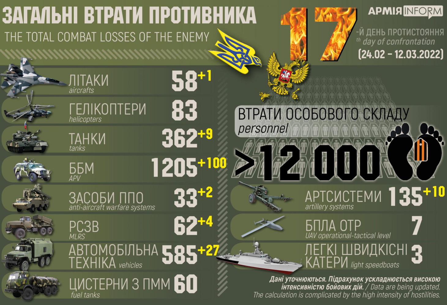 Генеральный штаб Вооруженных сил Украины обновил данные по потерям российских нацистов, понесенных ими с 24 февраля. Согласно данным военных, в украинской земле уже лежит свыше 12 тысяч солдат, сержантов и офицеров армии РФ. Украинские защитники уничтожили 362 танка, 1205 боевых бронированных машин, 135 единиц артиллерии, 62 системы РСЗО, 33 средства противовоздушной обороны, 58 самолетов, 83 вертолета, 585 автомобилей, два катера и один корабль, 60 цистерн с горючим, семь БПЛА оперативно-тактического уровня. Данные уточняются. Подсчет потерь противника затруднен в связи с высокой интенсивностью боевых действий. СМЕРТЬ РОСІЙСЬКИМ ОКУПАНТАМ! Помітили помилку? Виділяйте слова з помилкою та натискайте control-enter |