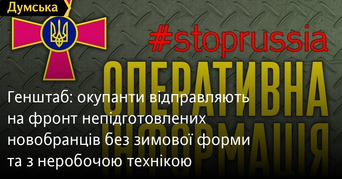 Генштаб: окупанти відправляють на фронт непідготовлених новобранців без зимової форми та з неробочою технікоюРосійські нацисти продовжують безуспішні спроби наступати в районі Авдіївки та Бахмута, на інших напрямках вороги намагаються утримувати зайняті території. За даними Генерального штабу Збройних сил України, російське командування кидає на фронт нещодавно мобілізованих солдатів, які не пройшли мінімальної підготовки та не вміють поводитися навіть зі стрілецькою зброєю. Це призводить до масових втрат серед окупантів. Крім того, новоприбулі рашисти не мають зимової форми. Це призводить до випадків мародерства, що почастішали – ворожі солдати намагаються «утеплюватися» речами, які відбирають у цивільних. Значна частина військової техніки, яку в Росії знімають із баз зберігання для комплектації підрозділів «мобиків», частково або повністю небоєздатна. Такі випадки масово фіксуються на донецькому напрямку, зокрема йдеться про старі танки Т-62. Сукупність цих чинників призводить до частих випадків здачі російських солдатів у полон. За добу українська авіація завдала 14 ударів по місцях зосередження живої сили та техніки ворога. Наші воїни ППО збили вертоліт Ка-52 «Алігатор» та штурмовик Су-25. Ракетні та артилерійські підрозділи вразили два райони зосередження ворожих сил. Підтверджено знищення протягом кількох останніх днів двох ворожих складів боєприпасів та понтонної переправи з військовою технікою на Херсонщині. СМЕРТЬ РОСІЙСЬКИМ ОКУПАНТАМ! Помітили помилку? Виділяйте слова з помилкою та натискайте control-enter |