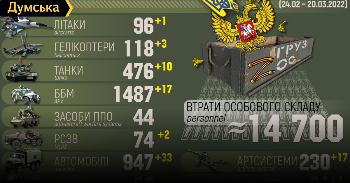 Генеральный штаб Вооруженных сил Украины обнародовал свежие данные по потерям российских нацистов с начала полномасштабного вторжения РФ. Так, с 24 февраля по 20 марта враг потерял примерно 14700 солдат и офицеров, 476 танков, 1487 боевых бронированных машин, 230 артсистем, 74 единицы РСЗО, 33 средства ПВО, 96 самолетов, 118 вертолетов, 947 автомобилей, два катера и один корабль, 60 цистерн с горюче-смазочными материалами, 21 БПЛА оперативно-тактического уровня, 12 единиц специальной техники. За минувшие сутки украинские защитники уничтожили один самолет и три вертолета, десять танков, 17 ББМ, две РСЗО, 33 автомобиля, одну единицу спецтехники, 17 артсистем и четыре БПЛА. СМЕРТЬ РОСІЙСЬКИМ ОКУПАНТАМ! Помітили помилку? Виділяйте слова з помилкою та натискайте control-enter |