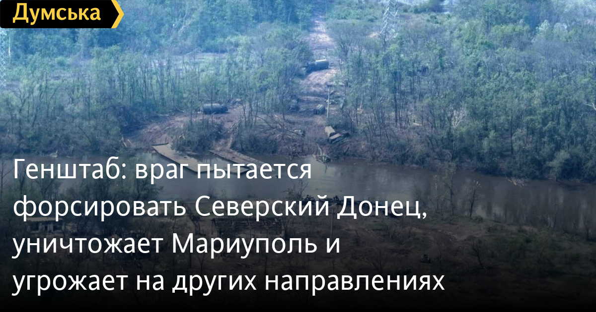 Генштаб: враг пытается форсировать Северский Донец, уничтожает Мариуполь и угрожает на других направленияхВраг продолжает полномасштабную вооруженную агрессию против Украины и не продолжает наступательные действия в Восточной операционной зоне. Генеральный штаб Вооруженных сил Украины опубликовал сводку о текущей ситуации на передовой. На волынском и полесском направлениях активные действия противника не отмечены. По имеющейся информации, продолжается второй этап проверки готовности подразделений вооруженных сил беларуси под личным руководством начальника генерального штаба. Проведена плановая проверка готовности системы оповещения. Продолжает сохраняться угроза ракетно-бомбовых ударов из беларуси по инфраструктурным объектам на территории Украины. На северском направлении противник продолжает обеспечивать усиленную охрану участка украинско-российской границы в Брянской и Курской областях. Совершал обстрелы приграничных районов Украины. Вероятно, враг продолжит ведение демонстрационных действий на указанном участке государственной границы Украины и обстрелы с территории российской федерации с целью недопущения перемещения подразделений наших войск на другие направления. На харьковском направлении основные усилия неприятеля сосредотачивались на недопущении продвижения наших войск и освобождения временно занятых российскими оккупантами территорий. В течение суток противник обстреливал позиции наших войск в районах населенных пунктов Питомник и Русские Тишки. На славянском направлении враг активных действий не предпринимал. Основные усилия сосредотачивались на пополнении запасов материально-технических средств для наращивания наступательных способностей. Вел обстрелы в районах населенных пунктов вдоль линии столкновения. Осуществлял воздушную разведку с помощью БПЛА «Орлан-10». На донецком направлении захватчики применяли минометы, ствольную артиллерию, реактивные системы залпового огня и наносили ракетно-бомбовые авиационные удары с целью разрушения укреплений наших подразделений. На лиманском направлении враг пытается захватить участок местности на правом берегу реки Северский Донец и закрепиться в районе населенного пункта Александровка. Совершал штурмовые действия в направлении населенного пункта Новоселовка, успеха не имеет. На северодонецком направлении противник продолжает штурмовые действия в районе населенного пункта Воеводовка, успеха не имеет. На бахмутском, авдеевском и кураховском направлениях враг ведет штурмовые действия с целью улучшения тактического положения своих войск, успеха не имеет. В Мариуполе враг продолжил наносить артиллерийские и авиационные удары, основные усилия сосредотачивал на блокировании наших подразделений в районе завода «Азовсталь». Российские захватчики проводили воздушную разведку с применением БПЛА в районах Покровска, Славянска и Павлограда. На южнобужском направлении враг активных боевых действий не вел, продолжает удерживать занятые позиции. Основные усилия сосредотачивались на огневом поражении подразделений наших войск и наращивании системы радиоэлектронной борьбы. По имеющейся информации, противник провел наращивание системы противовоздушной обороны в западной части Крымского полуострова. Российские захватчи