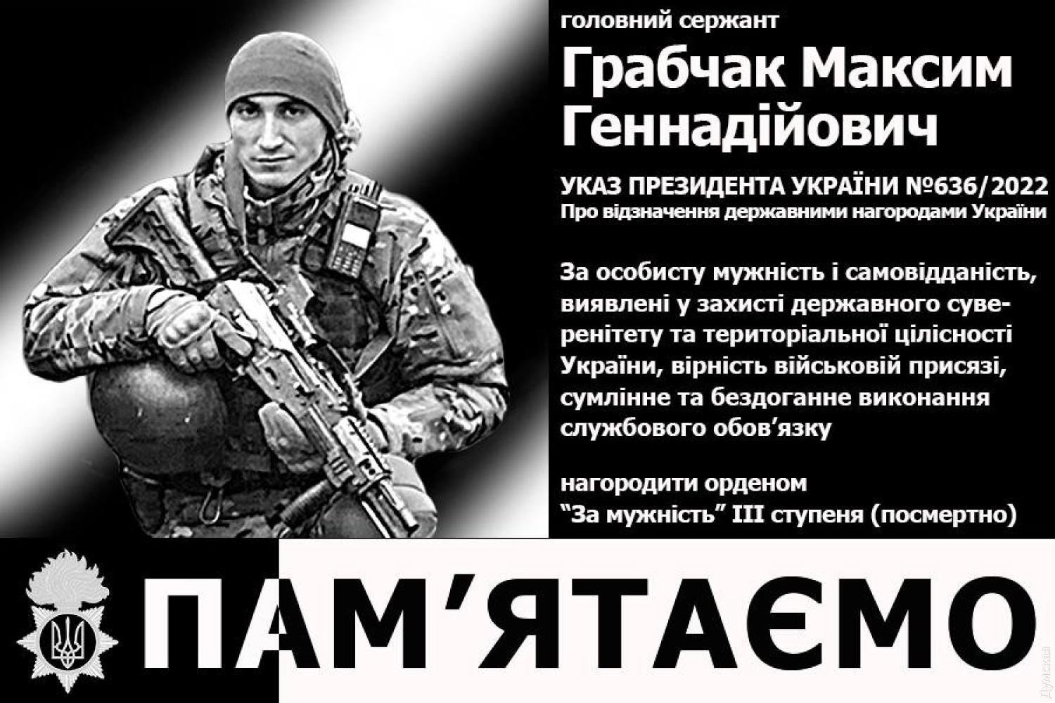 Героїчний нацгвардієць з Одещини отримав орден «За мужність» посмертноДружина загиблого на фронті уродженця Одеської області, військовослужбовця Національної гвардії України Максима Грабчака отримала орден «За мужність» III ступеня, яким був посмертно нагороджений її чоловік. Про це повідомили в Південному оперативно-територіальному об'єднанні НГУ. Максим Грабчак загинув під час бою з окупантами в Донецькій області 12 серпня 2022 року. Під час проведення зачистки місцевості його група потрапила у ворожу засідку. Воїн самовіддано відвернув вогонь окупантів на себе, чим дав змогу товаришам по службі організувати оборону та відбити атаку. Під час бою Максим Грабчак отримав смертельне поранення. «Схиляємо голови перед захисниками України, які віддали свої життя за єдність країни, встановлення миру та спокою на рідній землі, та низько вклоняємося батькам і рідним наших Героїв. Кожен назавжди залишиться в пам'яті поколінь українців та близьких прикладом справжнього захисника та відданого сина Батьківщини. На превеликий жаль, війна забирає таких вірних патріотів України, як Максим. Але ми обов'язково вистоїмо і здобудемо Перемогу над ворогом», — зазначив нацгвардієць, який пліч-о-пліч із Максимом захищав нашу країну від російських окупантів. СМЕРТЬ РОСІЙСЬКИМ ОКУПАНТАМ! Помітили помилку? Виділяйте слова з помилкою та натискайте control-enter |