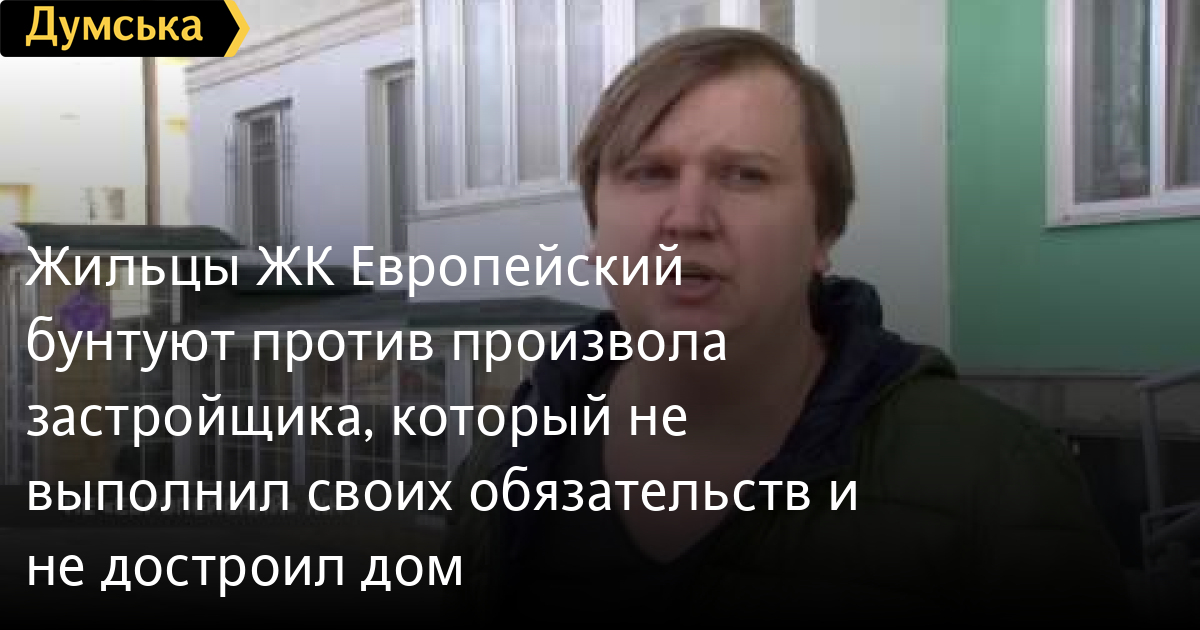 Жильцы ЖК «Европейский» бунтуют против произвола застройщика, который не выполнил своих обязательств и не достроил дом«Европейский» только на словах. Жилой комплекс на Бочарова, 44 снова в центре скандала. Жильцы бунтуют против произвола застройщика, который не выполнил своих обязательств и не достроил дом. 6 лет люди – в ожидании окончания строительства многоэтажки, но все силы застройщик направил на возведение нового комплекса – «Суворовского». В непростой ситуации разбирался Павел Репин. СМЕРТЬ РОССИЙСКИМ ОККУПАНТАМ! Заметили ошибку? Выделяйте слова с ошибкой и нажимайте control-enter Думская ТВ. Сюжеты: