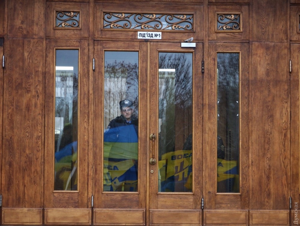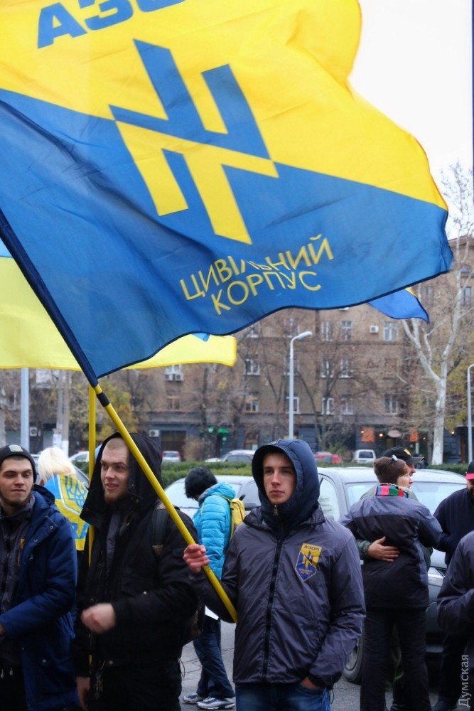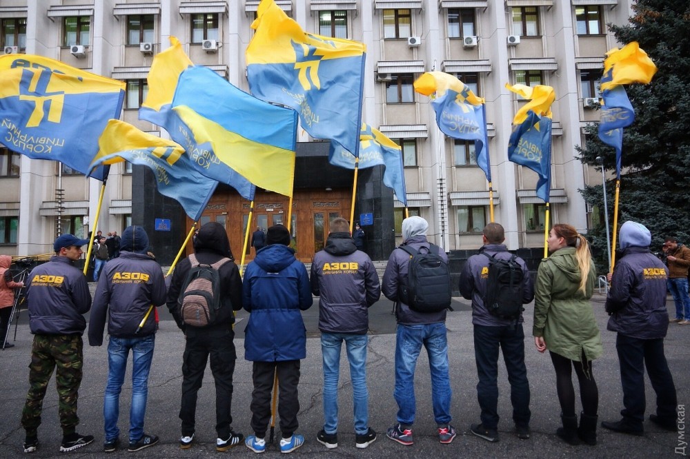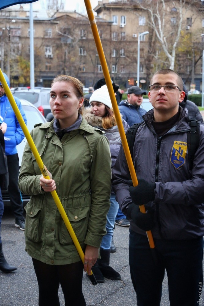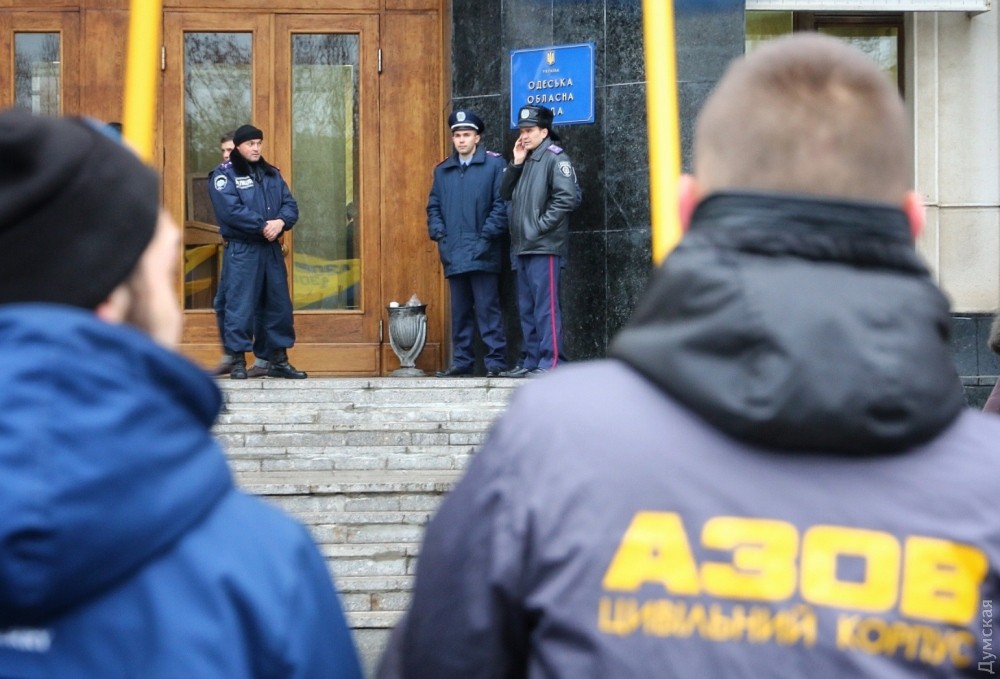 Сегодня днем около двух десятков активистов гражданского корпуса «Азов» пикетировали здание Одесской областной государственной администрации. По мнению молодых людей, результаты прокурорского конкурса, который завершился 17 ноября, не отвечают озвученным ранее губернатором Одесской области Михаилом Саакашвили и заместителем генерального прокурора страны Давидом Сакварелидзе принципам.