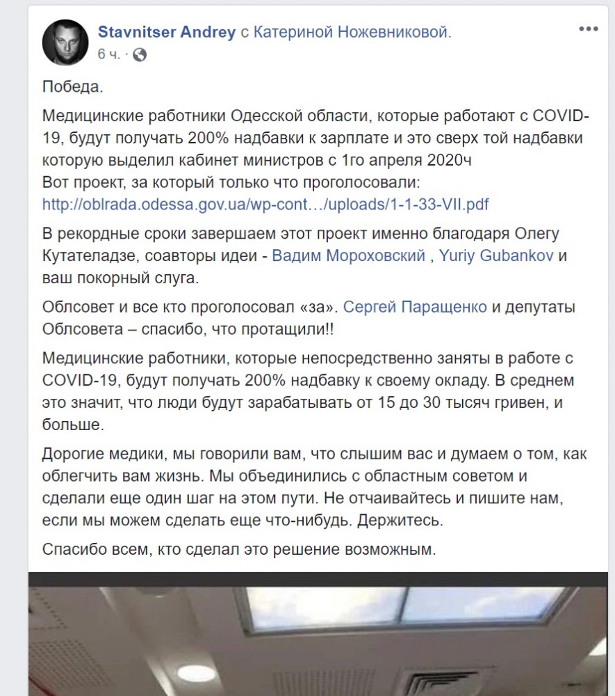 «Соавторы идеи — Вадим Мороховский, Юрий Губанков и ваш покорный слуга, — уточнил Андрей Ставницер на своей странице в Facebook. — Облсовет и все, кто проголосовал «за», Сергей Паращенко и депутаты облсовета – спасибо, что протащили! Медицинские работники, которые непосредственно заняты в работе с COVID-19, будут получать 200% надбавку к своему окладу. В среднем это значит, что люди будут зарабатывать от 15 до 30 тысяч гривен и больше».
