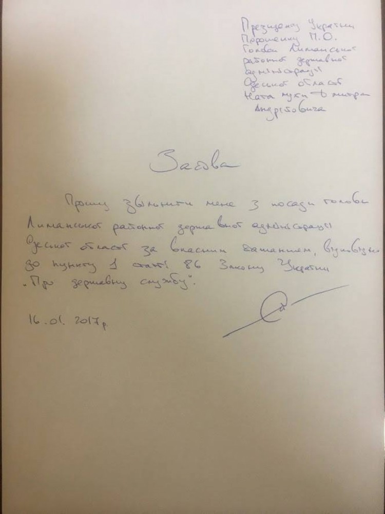 Глава Лиманской районной администрации Одесской области Дмитрий Наталуха написал второе заявление об увольнении. На этот раз представитель команды экс-губернатора Саакашвили хочет уйти «по собственному желанию». На своей странице в Facebook Наталуха написал, что передал заявление новому губернатору Максиму Степанову. Глава РГА посетовал, что еще 3 октября прошлого года подал заявление об отставке с другой формулировкой — «в связи с переводом на должность первого заместителя главы ОГА по результатам конкурса», но президент его не принял. СМЕРТЬ РОСІЙСЬКИМ ОКУПАНТАМ! Помітили помилку? Виділяйте слова з помилкою та натискайте control-enter