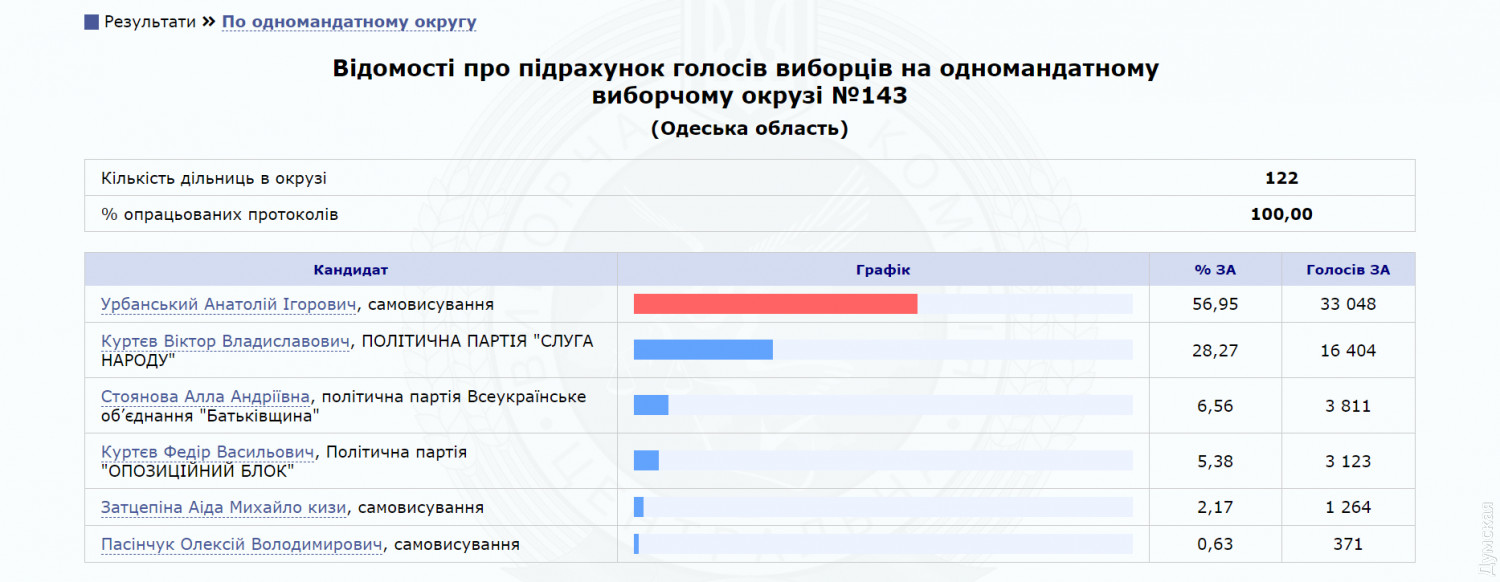 Центризбирком назвал победителя парламентских выборов в одномандатном округе №143 с центром в городе Измаил. Больше всего голосов избирателей набрал действующий глава Одесского облсовета Анатолий Урбанский, который набрал более 33 тысяч или 56,95% голосов. Урбанский с большим отрывом обошел представителя партии «Слуга народа» Виктора Куртева, который набрал 16 тысяч или 28% голосов избирателей. В тройку лидеров на этом округе также вошла представитель «Батькивщины» Алла Стоянова. За нее проголосовали около 4 тысяч человек. Это 6 с лишним процентов. СМЕРТЬ РОСІЙСЬКИМ ОКУПАНТАМ! Помітили помилку? Виділяйте слова з помилкою та натискайте control-enter