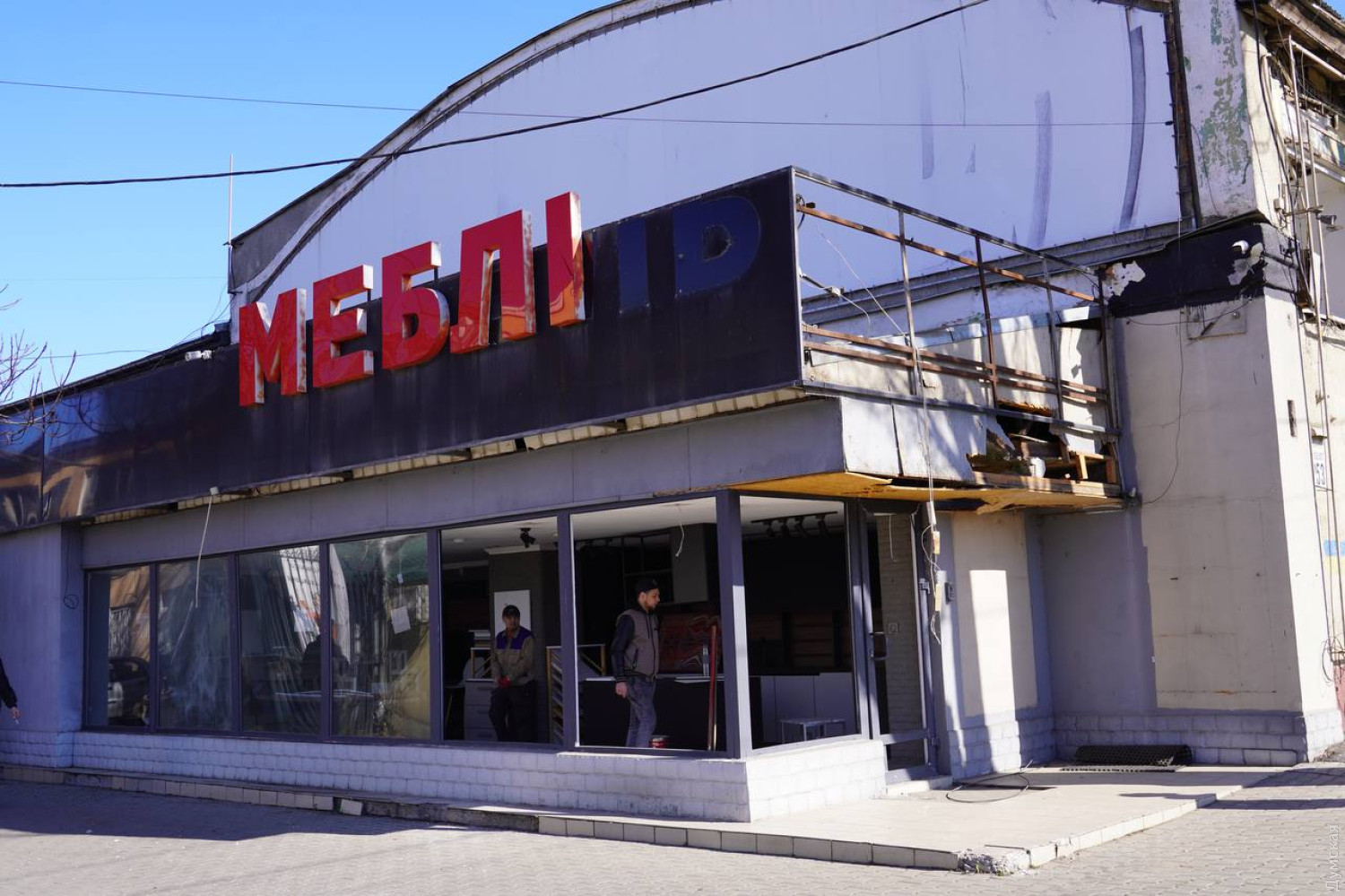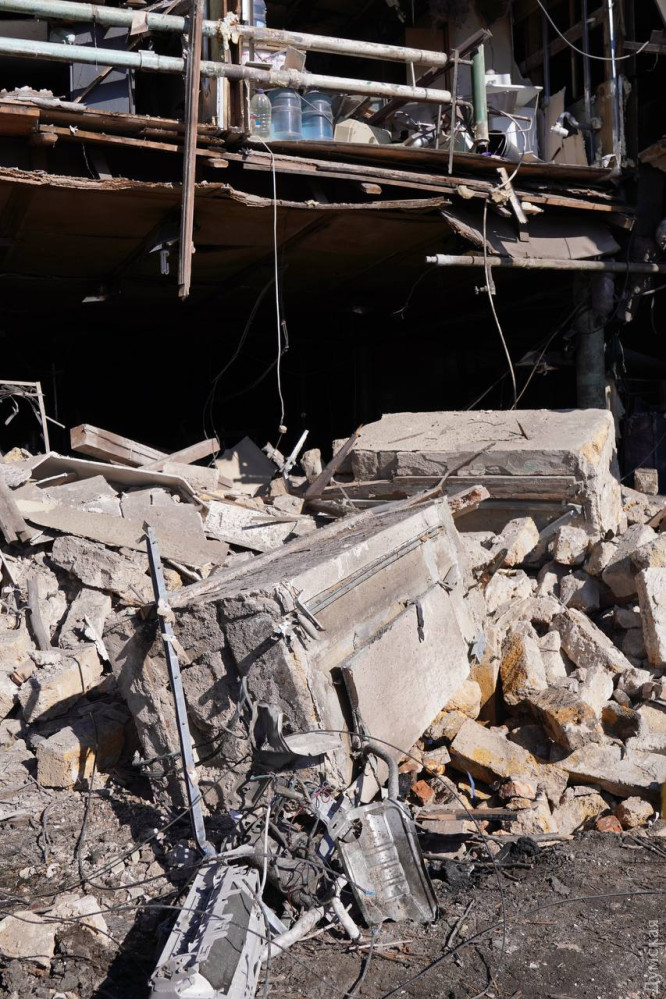 В этом помещении был пожар вследствие атаки. Спасатели до сих пор проливают.