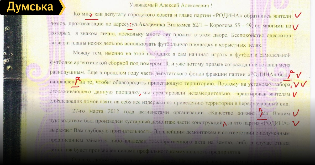 Зампред областного совета Алексей Гончаренко ответил на письмо Игоря Маркова. Он советует лидеру партии «Родина» нанять репетитора по русскому языку. Об этом говорится в письме, направленном зампредом облсовета Игорю Маркову. Главный «родинец» написал письмо Гончаренко с просьбой забрать деньги за демонтаж забора, который окружал футбольное поле на Королева, 55.