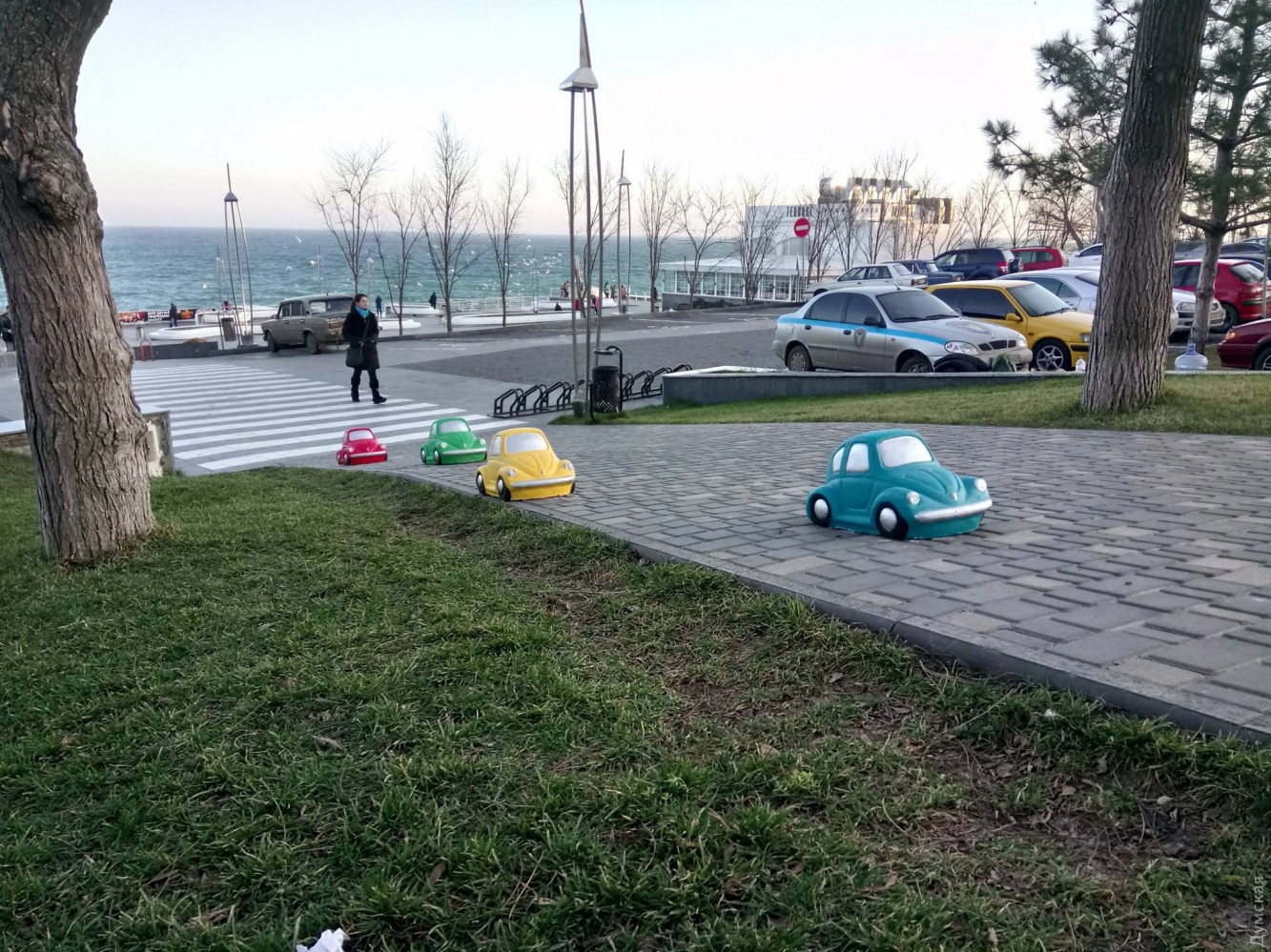 за те прикольные машинки возле Дельфинария можно зацепиться, летом они будут мешать многочисленным пешеходам разминуться на тротуаре.
