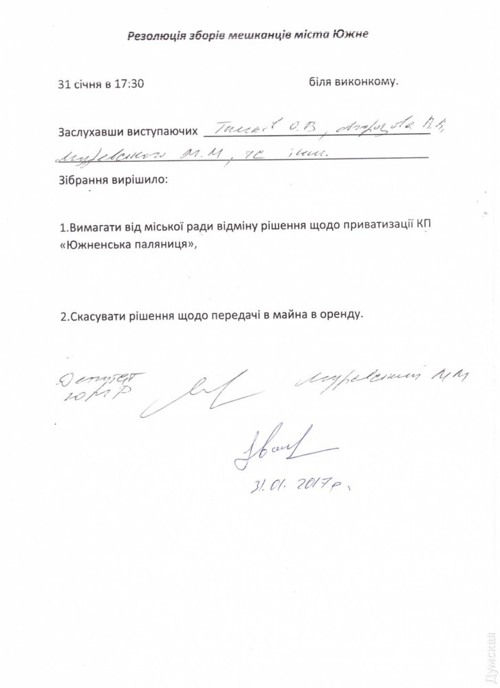 Городские власти Южного собираются приватизировать коммунальную пекарню. Жители протестуютЖители Южного вышли на акцию протеста против планов мэрии передать в аренду, а затем и приватизировать, коммунальное предприятие «Южненская паляниця». Предприятие, которое много лет обеспечивает свежим хлебом город, а также имеет сеть фирменных магазинов в Одессе, планируют сначала сдать в аренду на год, а в третьем квартале 2017 года — приватизировать. По мнению депутата горсовета Николая Муравского, причина такого решения кроется в выгодном расположении пекарни: производственный корпус находится между городским парком и пляжем. По циркулирующим слухам, неизвестный пока еще арендатор и будущий инвестор обещает построить для пекарни новое помещение, а освободившиеся площади использовать для своих объектов. Во вторник против приватизации возле здания мэрии протестовало около сотни горожан, в том числе работников предприятия. Городскую власть представлял секретарь горсовета Евгений Игнатовский, который пытался убедить собравшихся, что аренда и приватизация КП нужны для сохранения производства. В свою очередь, возмущенные горожане не вняли аргументам чиновника и приняли резолюцию с требованием отмены решений об аренде и приватизации предприятия. В пятницу резолюцию собрания рассмотрят на заседании профильной депутатской комиссии. Участники митинга предполагают, что депутаты проигнорируют мнение горожан, и готовятся продолжить протесты. СМЕРТЬ РОСІЙСЬКИМ ОКУПАНТАМ! Помітили помилку? Виділяйте слова з помилкою та натискайте control-enter |