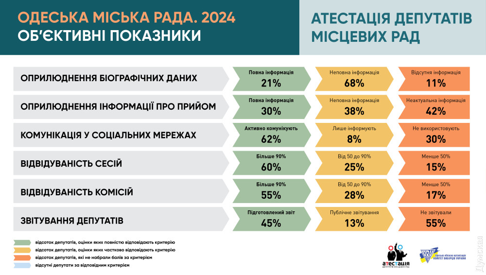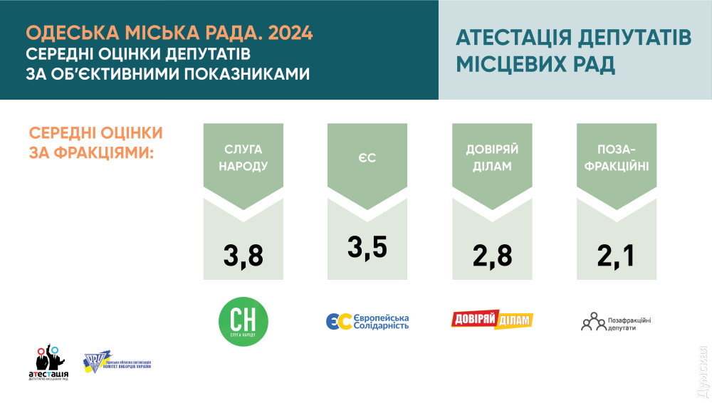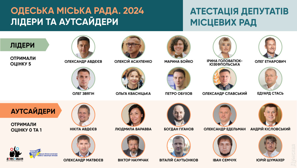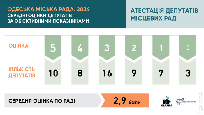Міськрада на трієчку: одеських депутатів перевірили на відкритість і чесність, відмінників виявилося малоПонад третина депутатів Одеської міської ради за підсумками 2024 року отримали негативні оцінки за свою роботу. Згідно з даними, що оприлюднив Комітет виборців України, експерти оцінили діяльність 53 із 56 обранців за 18 показниками відкритості, прозорості та доброчесності. Понад третина (36%) набрали лише від 0 до 2 балів. «Трієчників» виявилося 16 осіб (30%), а на «четвірки» напрацювали лише 8 депутатів (15%). Відмінників набралося більше, ніж 2023 року — 10 депутатів (19%). Це Олександр Авдєєв (фракція «Українська мрія»), «слуги» Олексій Асауленко, Ольга Квасницька та Олександр Славський, представники «Євросолідарності» Марина Бойко, Олег Звягін, Петро Обухов та Едуард Стась, а також «довіряйці» Ірина Головатюк-Юзефпольська та Олег Етнарович. Якщо дивитися за фракціями, то найкраще себе показали «Слуги народу» із середнім балом 3,8. За ними слідує «Європейська солідарність» із 3,5, а ось промерська «Довіряй ділам» підкачала, отримавши всього 2,8 бала. Найгірше працювали представники вже ліквідованих «ОПЗЖ» і «Партії Шарія», які зараз без фракцій, — їхній середній бал 2,1. Загалом же, весь депутатський корпус Одеської міськради дотягнув лише до 2,9 бала. Більшість депутатів воліють не афішувати свою діяльність: повні досьє (з освітою, досвідом, місцем роботи, партійністю та фото) оприлюднили лише 11 осіб. А в шістьох обранців на депутатському порталі взагалі немає ні відомостей про них, ні фото. Багато хто навіть не вказує, до якої партії належить. Соцмережі активно ведуть 37 депутатів, а 16 - ігнорують онлайн-зв'язок із громадою. З контактною інформацією теж біда: тільки 36 депутатів оприлюднили дані про свої приймальні. У підсумку, інформацію довелося збирати із соцмереж або через офіційні запити, на які відповіли не всі. При цьому реально ведуть прийом виборців 37 осіб, а про роботу решти 16 - нічого не відомо. Голова Одеської обласної організації «Комітет виборців України» Анатолій Бойко зазначив, що хоча депутати і стали частіше звітувати та спілкуватися з виборцями, системні проблеми нікуди не поділися. «Майже третина депутатів демонструє низький рівень відкритості, а відсутність актуальної контактної інформації та біографічних відомостей, звітів — це не тільки порушення базових принципів підзвітності, а й бар'єр для ефективної взаємодії з громадою Якщо вони в цій комунікації зацікавлені, вони її ініціюють. А виборець більш обмежений у можливості зворотної комунікації через те, що відсутня повна інформація про прийом і складно депутата знайти, або депутат тільки інформує, або взагалі не використовує соцмережі», — повідомив Бойко. Що стосується відвідуваності засідань, то порівняно з попереднім роком тут є невеликі поліпшення. Але «прогульники» все одно залишилися. Четверо (Сергій Данилюк, Олександр Едельман, Олександр Матвєєв, Юрій Шумахер) відвідали менше половини сесій. Чотири чинних депутати-втікачі не прийшли на жодне засідання міськради з початку повномасштабного вторгнення. Нікіта Авдєєв, наприклад, у своїй декларації прямо вказав, що живе у США. Шанувальник «русского мира» Богдан Гіганов активно освоює нові горизонти в бізнесі (працюючи на російські компанії) і, звичайно ж, не забуває про антиукраїнську пропаганду. А от Віталія С