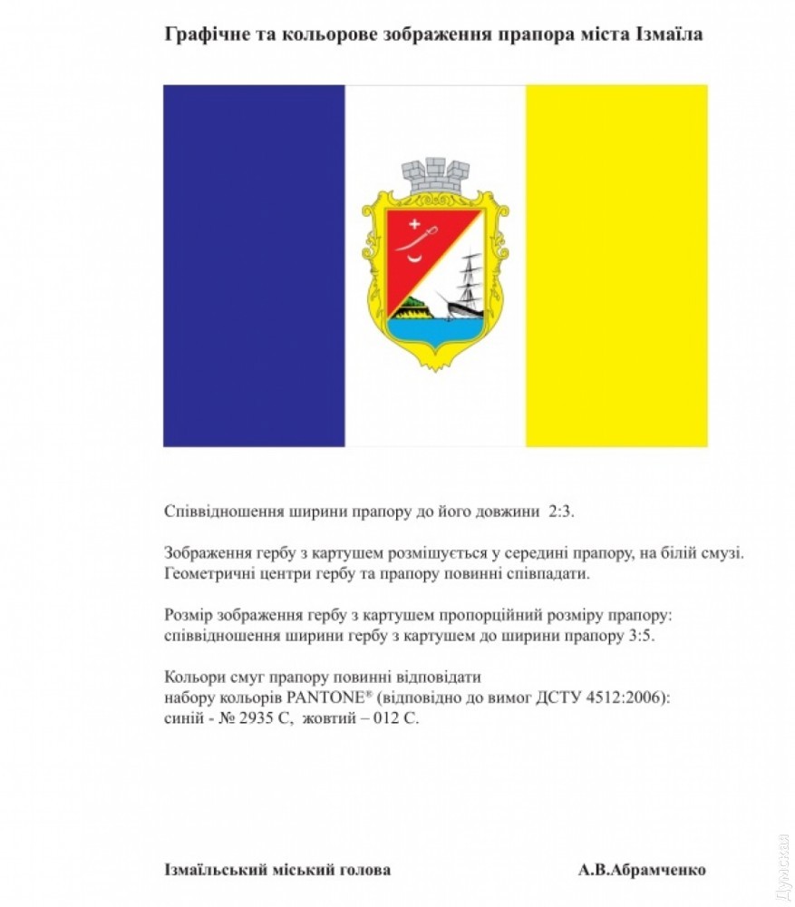 Исполком Измаильского горсовета вынес на рассмотрение сессии собрания проект решения о флаге города. Об этом сообщили в муниципалитете. Сессия пройдет 28 февраля. Согласно проекту, флаг Измаила будет представлять собой прямоугольное полотно с соотношением сторон 2:3, поделенное на три равные вертикальные полосы — синюю, белую и желтую. На белой полосе размещается герб города с картушем. «Цвета флага символизируют: синий — честь, верность и искренность; белый — мир, веру и мудрость; желтый — уважение, процветание и успех. Синий и желтый цвета повторяют цвета Государственного флага Украины — нашей страны, неотъемлемой частью которой является город Измаил», — говорится в документе. СМЕРТЬ РОСІЙСЬКИМ ОКУПАНТАМ! Помітили помилку? Виділяйте слова з помилкою та натискайте control-enter |
