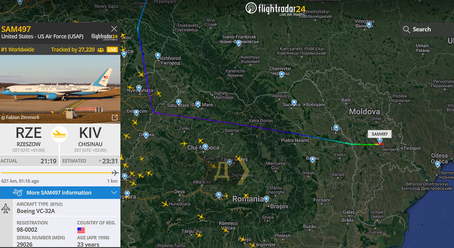 Правительственный Boeing VC-32A (модификация пассажирского Boeing757) коснулся ВПП Кишинева в 23:45.