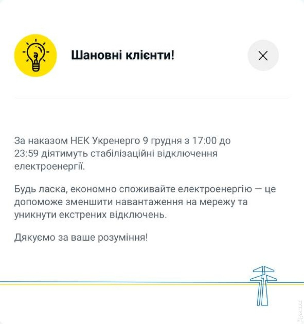 Екстрені відключення скасовані. В Одесі та області знову діють графіки.