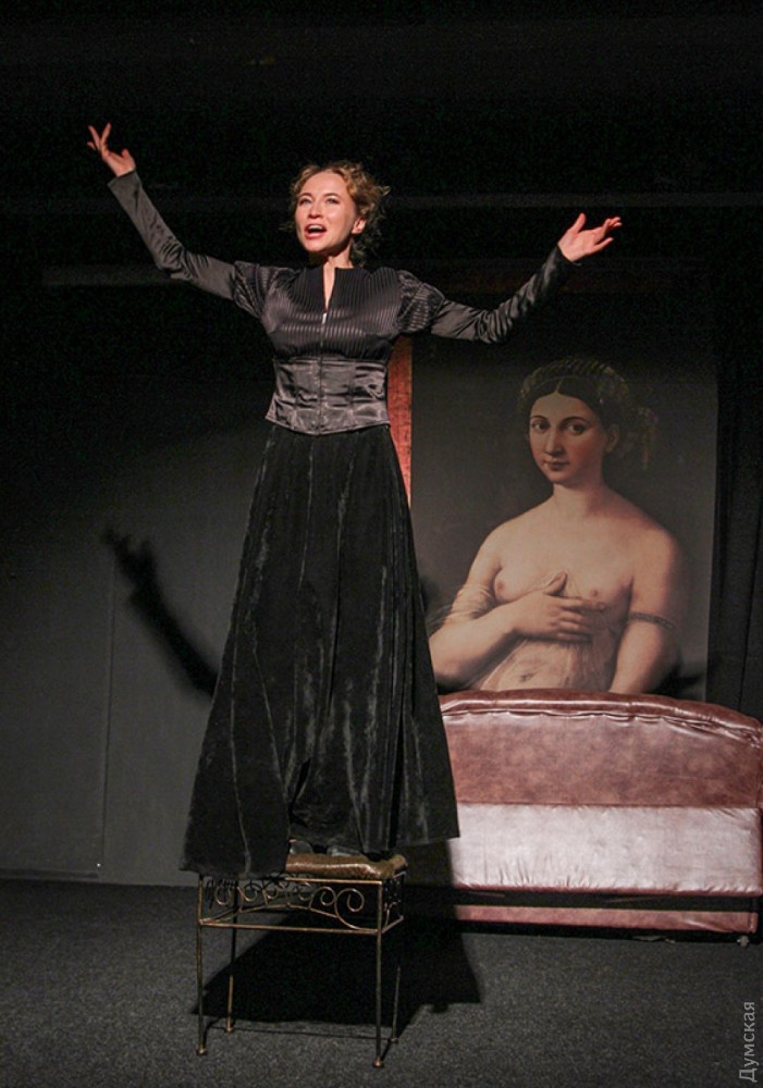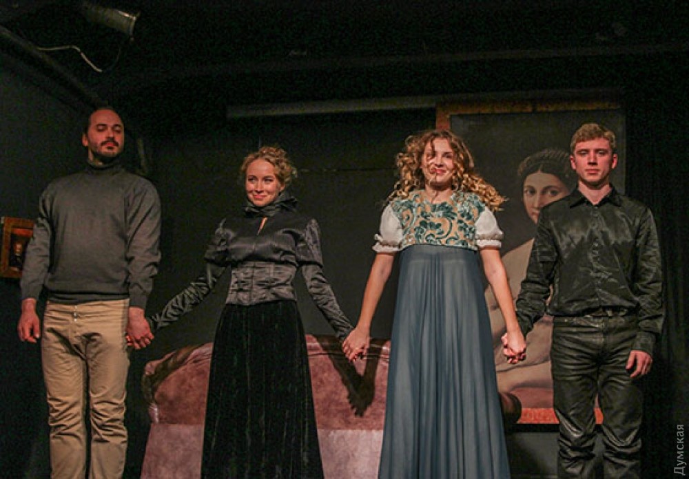 Грузинская красота, роман на троих и статный батюшка: одесский театр «На Чайной» представляет «Натали»В театре «На Чайной» (Карантинная, 21/1) с большим успехом идет спектакль «Натали» по одноименному рассказу Ивана Бунина. «Думская» там была и советует последовать ее примеру, к тому же неоднократно. Директор театра и режиссер-постановщик «Натали» Александр Онищенко справедливо полагает, что спектакль должен постоянно меняться, наполняться новым содержанием. И каждый раз впечатление будет несколько иным, но неизменно ярким. Мы уже и забыли, что театр может быть таким… Доминантой декорационного решения стала проекция портрета Форнарины, которая была моделью и возлюбленной великого Рафаэля. Конечно, Бунин не писал о присутствии оригинала или копии Рафаэля в помещичьем доме, у него обозначена «… над широчайшей дубовой кроватью картина во всю стену: почерневший лаковый фон, на нем еле видные клубы смугло-дымчатых облаков и зеленовато-голубых поэтических деревьев, а на переднем плане блещет точно окаменевшим яичным белком голая дородная красавица, чуть не в натуральную величину, стоящая вполуоборот к зрителю гордым лицом и всеми выпуклостями полновесной спины, крутого зада и тыла могучих ног, соблазнительно прикрывая удлиненными расставленными пальцами одной руки сосок груди, а другой — низ живота в жирных складках…» Этот текст, на одном дыхании произнесенный главным героем Виталием Мещерским (Владислав Костыка), не искажается переделками, проза оказалась распределенной между персонажами. Влад Костыка – один из наиболее востребованных одесских актеров, он играет принца Гамлета в ТЮЗе, других красавчиков-принцев в антрепризных мюзиклах, и все успешно, однако наиболее полно он раскрывается именно здесь, «На Чайной». Пишет стихи, притом замечательные, и на сцене тоже остается поэтом. Он задействован в шести постановках «чайников», среди которых – пластичный бессловесный и безымянный персонаж («Две дамочки в сторону севера») и мечтающий о любви слепой юноша Дональд Бейкер («Маленький Донни, победивший мрак»). Чтобы перевоплотиться в Мещерского с его «грузинской красотой», Владу достаточно нарисовать над верхней губой изящные усики, остальное делает бронебойное обаяние, и не удивляешься, что этот сердцеед влюбил в себя сразу двух девушек… Между Виталием, Соней (Валерия Задумкина) и Натали (Юлия Амелькина) бушуют подобные майской грозе молодые страсти (возраст зрителей – строго 15 +), а вот Петр Липинский в ролях хромого отставного улана Черкасова и пианиста-тапера оттеняет эту бурю и аккомпанирует ей. В сцене бала Петр поведет Юлию в танце, и это будет уже чопорная, без обоюдной любви сосватанная пара, слова не понадобятся, остаточно движений мертвенных, ритуальных, заученных… Да, и еще батюшка, отпевающий главную героиню, получится из него знатный, статный, с голосом зычным! Валерия Задумкина тоже будет перевоплощаться то в разбитную, ищущую приключений курсистку, то в забитую крестьянку Гашу. Но Виталий и Натали, вокруг которых закручена интрига, останутся в рамках своих образов. А публику в финале обязательно накроет мощной волной катарсиса, после чего, по доброй традиции, будет беседа с актерами и режиссером за чашкой чая, потрясенные лица, попытки выяснить «как вы все это делаете»… Как, как, методично, профессиональ