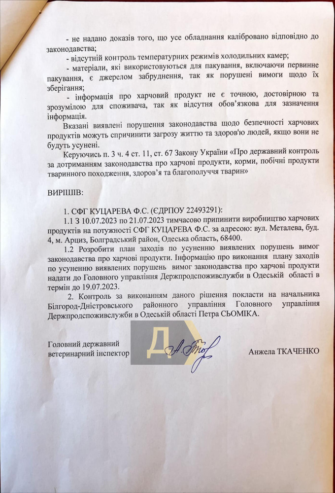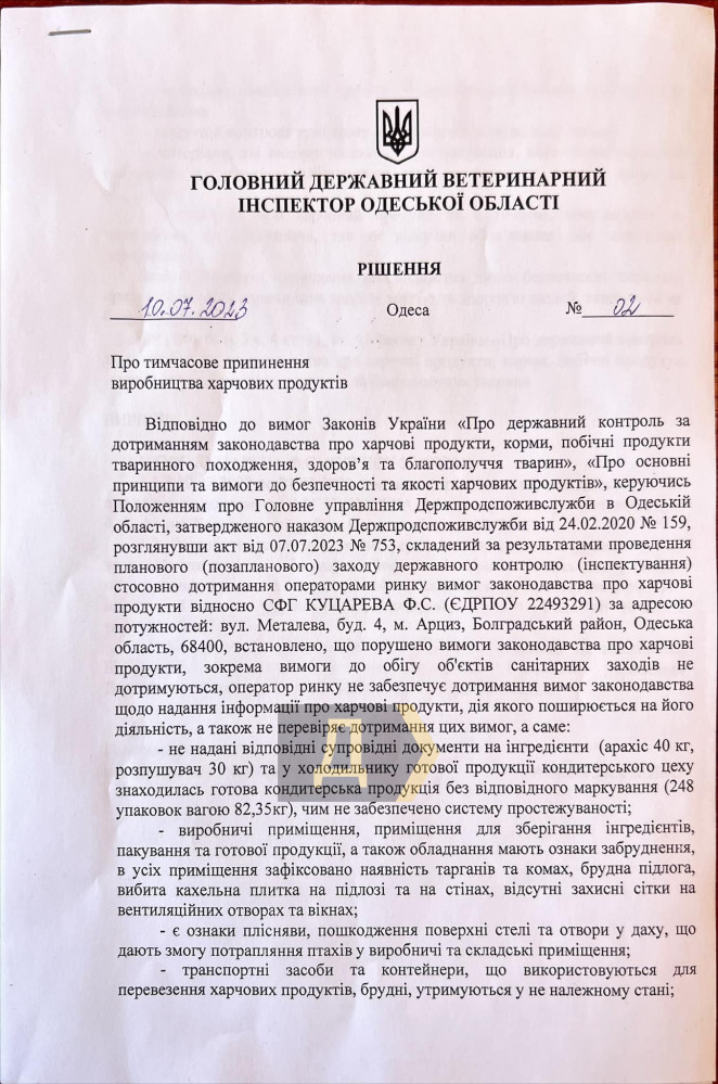 Бруд, пліснява і птахи: в Одеській області закрили хлібозаводАрцизький хлібозавод, що на півдні Одеської області, закрився на десять днів після перевірки інспекторів Держпродспоживслужби. Про це «Думській» повідомив власник підприємства Олексій Куцарев. Підприємство забезпечує хлібом, зокрема школи та дитсадки Арциза. Саме керівництво дитячих закладів і наполягло на перевірці, яка відбулася минулої п'ятниці. Акт обстеження, підписаний головним державним ветеринарним інспектором Анжелою Ткаченко, жахає подробицями. Згідно з документом, було виявлено плісняву на стінах і пошкодження стелі, що дає змогу птахам потрапляти у виробничі та складські приміщення, безліч тарганів та інших комах, бруд, відсутність інформації про продукти, порушення температурного режиму та багато іншого. Держспоживслужба постановила закрити завод на 10 днів і усунути порушення. «Перевіряльники були незадоволені побаченим, і вчора, в понеділок, запросили нас для підписання акта обстеження. Усе пояснили, що потрібно поміняти, що виправити. Ми підписали документ, і тут же інспектор виносить резолюцію — закрити підприємства негайно на десять днів. І ось уже сьогодні ми не працюємо», — нарікає Куцарев. Керівник підприємства таке суворе і раптове рішення пов'язує з низкою чинників: зменшення кількості інспекторів через укрупнення районів і бажання їх відзначитися перед начальством, а також можливі натяки на хабар, недобросовісна конкуренція. «Вони поводилися нормально, нічого не вимагали, я ні в чому нікого не звинувачую, у нас справді є проблеми, але, можливо, собака заритий в іншому місці. Після закінчення 10 днів ми в будь-якому разі відкриємося, питання тільки в результатах повторної перевірки: або їх задовольнять вжиті заходи, або вони звернуться до суду. Ми могли й не закриватися, але тоді нам загрожував би штраф у 120 тисяч гривень», — написав він. Власник підприємства повідомив нам, що сьогодні співробітники займаються виконанням припису. До слова, торік хлібозавод постраждав від ракетного удару окупантів і насилу відновив свої виробничі потужності. Помітили помилку? Виділяйте слова з помилкою та натискайте control-enter |