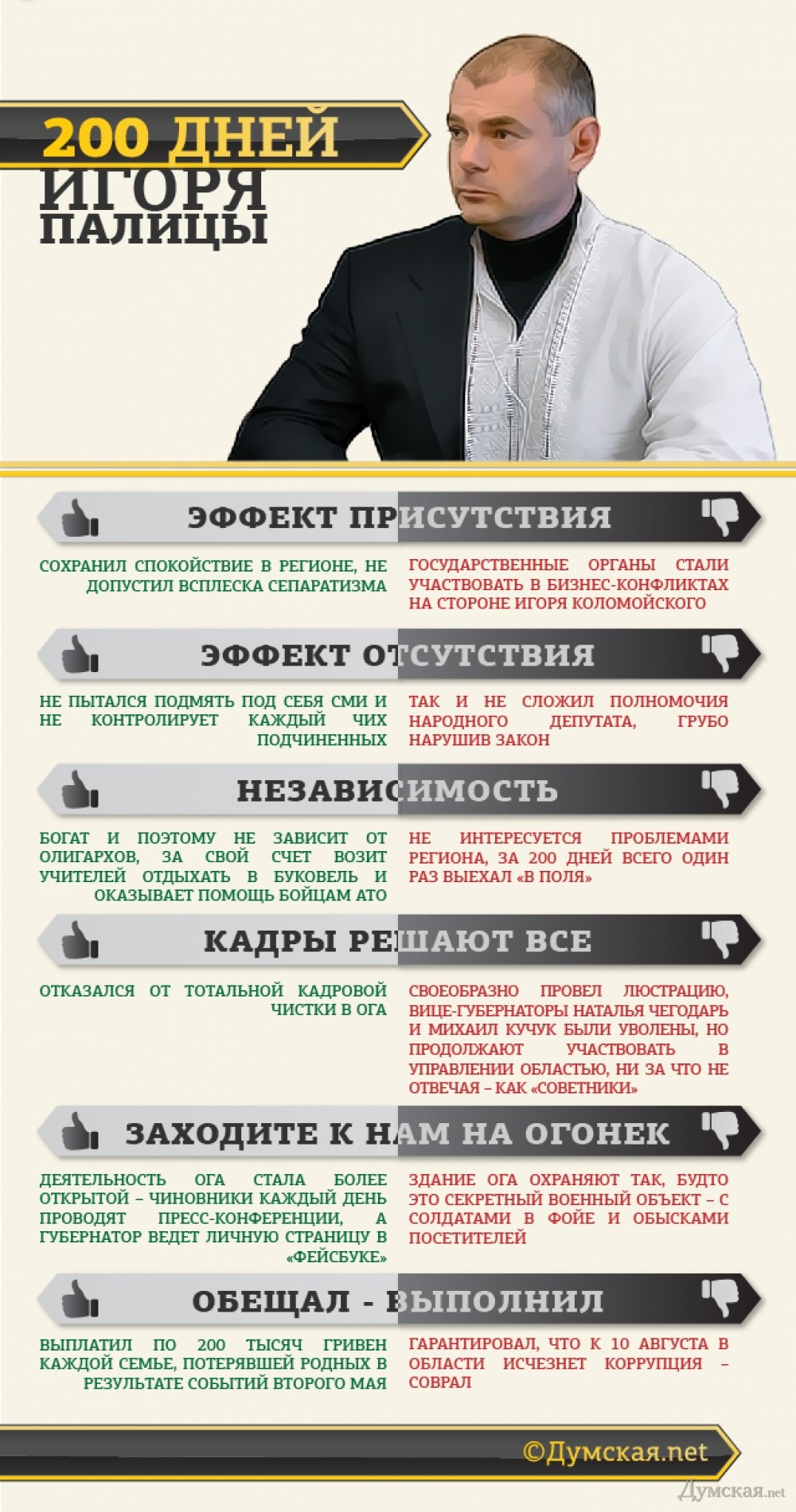 Два по сто Игоря Палицы: губернатор заплатил семьям жертв 2 мая, оставил у кормила Чегодарь и проиграл коррупции (инфографика)Прошло двести дней с момента назначения Игоря Палицы главой Одесской областной государственной администрации. Срок — более чем достаточный для того, чтобы проанализировать работу и подвести какие-то итоги. Оценивать деятельность украинского губернатора, да еще в наше непростое время — занятие сложное и неблагодарное. Но одно несомненно: Игорь Палица — человек неоднозначный, сочетающий как положительные, так и отрицательные качества. «Думская» попыталась взглянуть на чиновника и его деятельность на посту максимально объективно. ЭФФЕКТ ПРИСУТСТВИЯ Указ о назначении Палицы главой Одесской области тогдашний руководитель страны Александр Турчинов подписал 6 мая - через четыре дня после памятной трагедии и через два дня после штурма городской милиции, в результате которого на свободу вышли десятки задержанных. Мы все прекрасно помним, что происходило в то время в стране и городе. Назначение главой ОГА бизнес-партнера олигарха Коломойского, настроенного на сохранение единства страны, стало сильным стабилизирующим фактором, охладившим многие горячие головы. В Одессе наступило спокойствие — пусть несколько перепуганное, но все же спокойствие. И это - несомненно позитивный для города результат. В то же время, крупный бизнесмен на такой должности в наших реалиях всегда остается бизнесменом. Палица, увы, не является исключением из этого правила. При нем государственные органы, которые и ранее в основном обслуживали интересы сильных мира сего, оказались вовлечены в целый ряд бизнес-конфликтов на стороне все того же Коломойского. Ситуация вокруг Одесского нефтеперерабатывающего завода и имущества Сергея Курченко, с которым владелец «Привата» находится в конфликте — яркий тому пример. ЭФФЕКТ ОТСУТСТВИЯ Нет сомнений в том, что Игорь Палица не связывает свою карьеру с с губернаторским креслом. По всей видимости, он понимает, что является временщиком, задача которого — сохранить спокойствие и «присмотреть» за бизнес-активами в сложное время. Позитивным результатом этого стало то, что губернатор даже не пытался взять под контроль медиапространство, не создавал собственные и не «покупал» чужие СМИ. Он не контролировал каждый шаг и каждый чих своих подчиненных, которые вполне даже имеют право на собственное мнение — конечно, в пределах общей руководящей линии. Вместе с тем, Игорь Палица изначально не собирался засиживаться в Одессе и сохранил для себя запасной парламентский аэродром. Спустя 200 дней с момента назначения на должность он так и не отдал мандат народного депутата, чем грубо нарушил закон. Более того, несмотря на заверения чиновника, он продолжает голосовать по важным вопросам в Верховной Раде: например, при принятии закона «Об очищении власти». Последний раз его карточка голосовала 20 октября — за изменения в законодательство о наследовании. По данным электронной и письменной регистрации, сам депутат-губернатор на этом заседании отсутствовал. За двести дней работы Игоря Палицы не происходило обычного для Одессы противостояния по линии «город-область» (хотя наметились признаки противостояния по другим линиям). Можно сказать, что правоохранительные органы действовали согласованно, на об