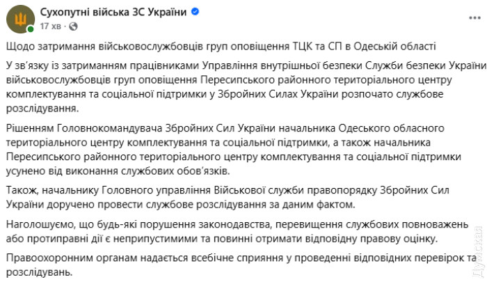 Отстранили начальника ТЦК и его заместителя: Сырский отреагировал на громкий скандал в Одессе (обновлено)Начальников Одесского областного и Пересипского районного ТЦК отстранили на время расследования в связи с громким скандалом в Одессе. Служебное расследование будет проводить Военная служба правопорядка, сообщили в Сухопутных войсках. Там подчеркнули, что оказывают правоохранительным органам всестороннее содействие. Напомним, сегодня, 21 апреля, в Одессе в ходе спецоперации СБУ задержали сотрудников групп оповещения Пересипского РТЦК и участкового полицейского. Задержание сопровождалось погоней и стрельбой на улице Балковской. По информации правоохранителей, группа сотрудников ТЦК вместе с участковым вымогали 30 тысяч долларов у бывшего военного, имевшего официальную отсрочку (удостоверение УБД). Мужчину силой затащили в микроавтобус и угрожали оружием. У задержанных во время обысков изъяли биты, кастеты, ножи и незарегистрированное огнестрельное оружие. По предварительным данным, группа работала систематически, вымогая деньги у «крупных клиентов». В Сухопутных войсках подчеркнули: любые нарушения законодательства, превышение служебных полномочий или противоправные действия недопустимы и должны получить соответствующую правовую оценку. ОБНОВЛЕНО 16:15 По данным источников «Думской» в Силах обороны, всем военнослужащим сегодня пришел приказ сверху о необходимости «информировать руководство обо всех случаях контактов с представителями ТЦК». СМЕРТЬ РОССИЙСКИМ ОККУПАНТАМ! Заметили ошибку? Выделяйте слова с ошибкой и нажимайте control-enter |