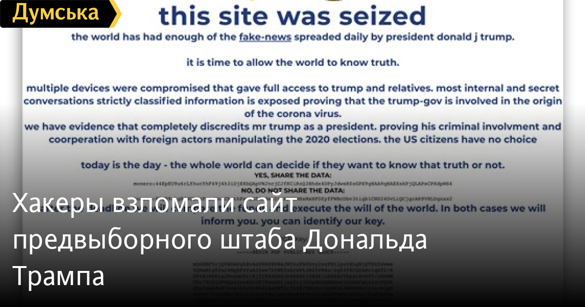 Неизвестные хакеры взломали сайт избирательного штаба президента США Дональда Трампа. Они разместили на сайте сообщение, в котором написали, что «мир устал от лживых новостей, которые ежедневно распространяет Дональд Трамп. Пора позволить миру узнать правду». В сообщении также указывалось, что хакеры завладели тайными данными, которые полностью дискредитируют и изобличают президента США. Пресс-секретарь избирательной кампании Трампа Тим Мертау заявил, что их команда сейчас сотрудничает с правоохранительными органами по расследованию источника атаки. «Хакеры не получили доступа к конфиденциальным данным, так как они не сохраняются на сайте. Сейчас работа сайта восстановлена», — отметил Мертау. Напомним, выборы президента США состоятся 3 ноября. Главным соперником Трампа является кандидат от демократической партии Джо Байден. СМЕРТЬ РОССИЙСКИМ ОККУПАНТАМ! Заметили ошибку? Выделяйте слова с ошибкой и нажимайте control-enter |