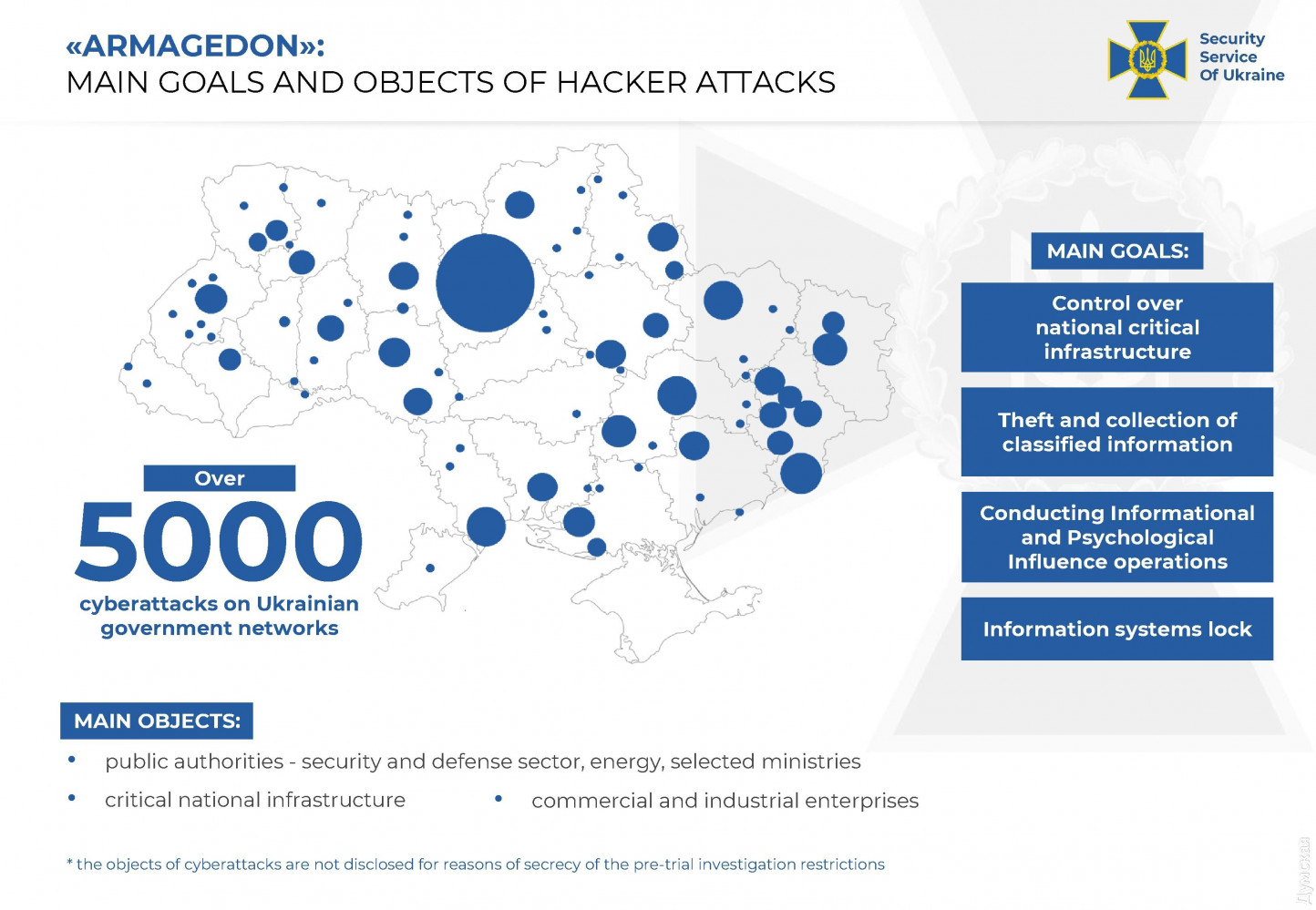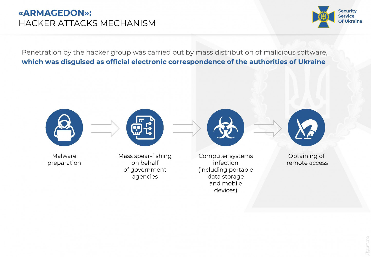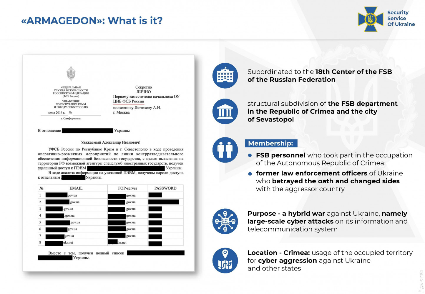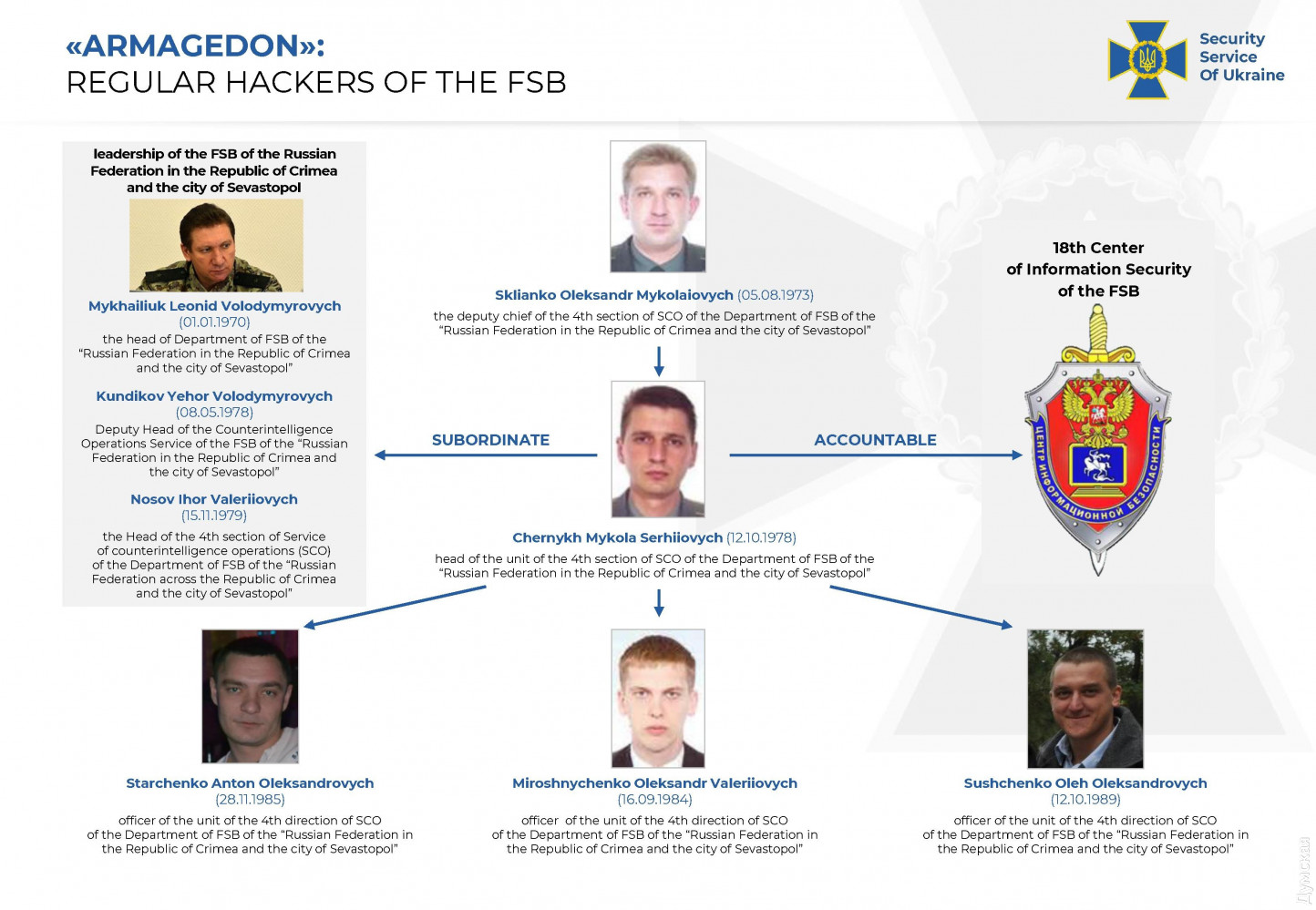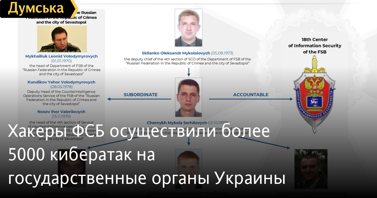 Хакеры ФСБ осуществили более 5000 кибератак на государственные органы УкраиныВсемирно известную группировку «ARMAGEDON», осуществившую более 5000 кибератак на государственные органы и объекты критической инфраструктуры Украины, разоблачили киберспециалисты СБУ. Как сообщили в пресс-центре ведомства, хакерами оказались офицеры так называемого Крымского ФСБ, а также предатели, перешедшие на сторону врага во время оккупации полуострова в 2014 году. «Украинской спецслужбе удалось поименно установить злоумышленников, перехватить их разговоры, а также получить доказательства их причастности к атакам», — сообщают в СБУ. Пятерым участника хакерской группы объявили о подозрении по ст. 111 УК Украины (государственная измена). По данным следствия, хакерская группировка «ARMAGEDON» – это спецпроект ФСБ РФ, прицельно «работавший» по Украине. Координацией их деятельности занимается 18-й Центр ФСБ РФ (Центр информационной безопасности) с дислокацией в Москве. Проводятся следственные действия и экспертные исследования для привлечения сотрудников ФСБ РФ к ответственности. Им вменяют шпионаж, несанкционированное вмешательство в работу электронно-вычислительных машин, создание с целью использования, распространения или сбыта вредоносных программных или технических средств.