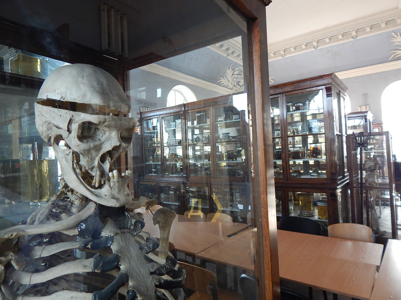 Об этом музее, как говорится, не писал только ленивый. Чем ближе к Хэллоуину, тем чаще редакторский взгляд устремляется в поисках чего-то ужасного (хэллоуинского) в родном городе. Но страшилок не так-то много: музей судебной медицины, музей при кафедре патологической анатомии, заклеенная скотчем скульптура над мэрией, зловещий Деволановский спуск, который, впрочем, уже не такой страшный, потому как ремонтируется, обогащая партнеров родного мэра-хозяйственника. «Но писали же!» — с досадой думает редактор. Про все это писали! И про отрезанную голову «смотрителя» музея, меняющего выражение лица, и про «антихриста» в формалине, эмбрионе теленка с мордой, искусно перекроенном компрачикосами под Мефистофеля. И про одесского нищего с искалеченными болезнью ногами, продавшего свой скелет Медину. Все эти уродства и диковинки описаны в десятках статей, о них снято невесть сколько телевизионных репортажей. - А что если узнать о «кухне» того же патологического музея? Поговорить с теми, кто стоит на пороге Великого Ничто? Как содержат уродцев в банках? Не балуют ли студенты? Не засовывают ли бычок в зубы скелету? Что думают сотрудники о ковиде? Иди, Жогов, и выясни! ОСТОРОЖНО, ФОТО МОГУТ ШОКИРОВАТЬ. В ВАЛИХОВСКОМ ПЕРЕУЛКЕ Мои глаза заволокло ностальгической дымкой, и я поскакал в музей. Вспомнилось, как я впервые подошел, вернее, подкатил к этому зданию. Конец восьмидесятых. Тогда была снежная зима, изрядно мело. Я работал санитаром во второй городской больнице и вез один каталку с завернутым в простыню трупом. Второй санитар, мой напарник, заболел. И студентов как на грех не было. Помочь некому. Простыня хлопала на ветру, обнажая желтое тело. Благо, никого в переулке не было. Ни души. Никто мытарств санитара с трупом не видел. А зрелище было неприглядное. Каталка норовила застрять на замерзших выбоинах в асфальте или свернуть по гололеду не туда, но я изо всех сил направлял ее к моргу. Ветер со снежной крупой толкал ее обратно. Я же двигался вперед. Моргов было два: «судебка» и напротив, если пересечь Валиховский переулок (тогда он назывался Наримана Нариманова), еще одно, как шутила судмедэксперт Богатская, «Место Отдыха Реанимационных Граждан». Хлюпающий красным от мороза носом, с покрасневшими от мороза же ушами, я добрался до красной двери морга. Надо сказать, что эту шикарную дверь, с колоннами по бокам, с широкими ступнями облюбовали киношники. Тут были и Гоцман, и Мишка Япончик. Больно уж хороши двери. А вы пробовали втащить каталку по мерзлым ступеням? Вот то-то и оно. Я совсем выдохся. И от меня валил пар. В секционном зале (так называется помещение для вскрытие трупов) никого не было. Где-то мерно капала вода. –Эй? Есть кто? — эхо заметалось по коридорам и затихло. Я оставил каталку возле двух каменных столов и пошел искать кого-то живого. И… засмотрелся на здание. Оно поразило меня своей «несоветскостью». Утонченное, холодное, с оперной акустикой и белоснежной фигурой человека с протянутой рукой на постаменте. Но это не вождь мирового пролетариата, как мне сперва показалось, а человек без кожи. Большая анатомическая скульптура «Экорше» Гудона. Знаменитый, а тогда еще молодой скульптор ваял Иоанна Крестителя. Делал это как положено — сперва скелет, потом мышцы, постепенно облекая его плотью и одеждой. Но эскиз Гудона заметили ценители искусств