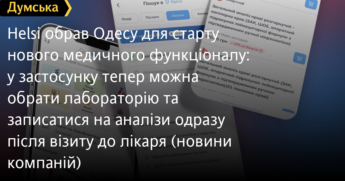 Helsi обрав Одесу для старту нового медичного функціоналу: у застосунку тепер можна обрати лабораторію та записатися на аналізи одразу після візиту до лікаря (новини компаній)Одесити можуть оформити запис на аналізи прямо в застосунку Helsi. Призначення автоматично відображаються, тож користувачам не потрібно вводити їх вручну. Новий функціонал допомагає обрати зручний варіант: порівняти лабораторії, перевірити вартість послуг і знайти найближче відділення. Йдеться насамперед про можливість скористатися послугами приватних лабораторій — у випадках, коли це зручніше, швидше або відповідає особистим очікуванням користувача. Проєкт стартував саме з Одеси як одного з міст із активною медичною інфраструктурою та високим попитом на цифрові сервіси у сфері здоров’я. На даний момент в Одесі у системі вже підключені Smartlab, CSD та Артмедіуз. Загалом по країні в Helsi доступно 12 мереж лабораторій, це понад 800 відділень. У застосунку також з’являтимуться спеціальні пропозиції від лабораторій — щоб користувачі могли обирати найбільш зручні та вигідні варіанти. СМЕРТЬ РОСІЙСЬКИМ ОКУПАНТАМ! Помітили помилку? Виділяйте слова з помилкою та натискайте control-enter |