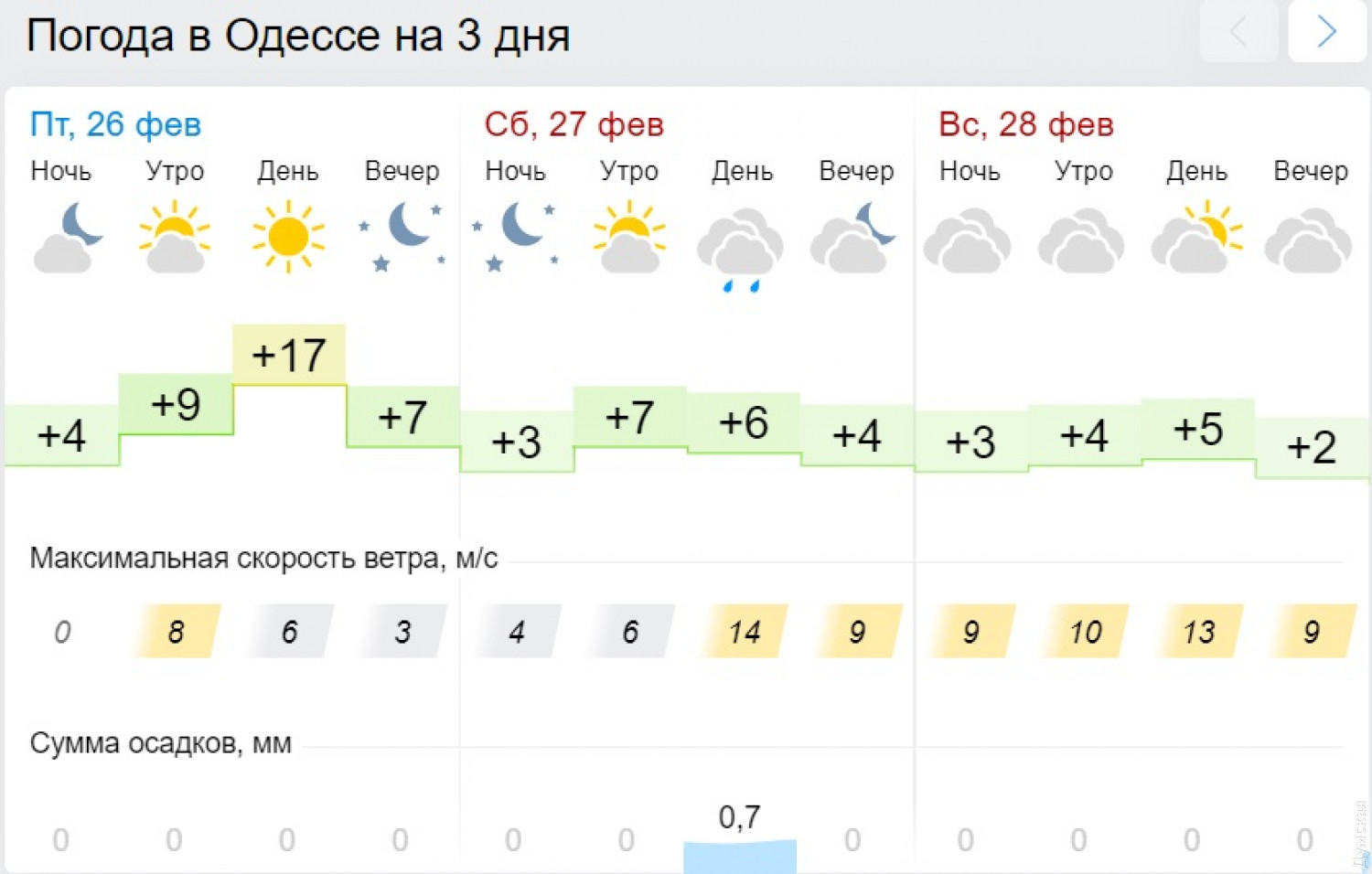 В преддверии весны в Одессе, по прогнозам синоптиков, поменяется погода. По данным Гидрометцентра Черного и Азовского морей, вместо теплых дней, приятно радовавших почти всю неделю, на выходных наступит похолодание. Причем температурный скачок обещает быть резким – от +18 сразу к 0 градусов. В субботу, 27 февраля, по данным синоптиков, с самого утра будет пасмурно. При этом небо останется затянутым тучами до вечера. Ночью и на следующее утро ожидаются туман и плохая видимость на дорогах, 200-500 м. Ночью столбики термометров покажут от 2 до 4 градусов с отметкой «плюс», днем +8 +10. В воскресенье, 28 февраля, тоже будет облачно, но осадков до вечера не предвидится. Ночью синоптики передают от 0 до +5 градусов, днем воздух прогреется до 3-8 тепла. Ветер в выходные направления не поменяет. А в ночь на 1 марта возможен «весенний» снег. Похолодание, предположительно, продержится минимум четыре дня. После этого в город и область снова вернется тепло. СМЕРТЬ РОСІЙСЬКИМ ОКУПАНТАМ! Помітили помилку? Виділяйте слова з помилкою та натискайте control-enter Новини по цій темі: 7 листопада 2025: До +16, але з дощами: в Одесі прогнозують погіршення погоди 29 жовтня 2025: Котельні готові: Одеса увімкне опалення за два тижні, а початок листопада буде аномально теплим 6 жовтня 2025: Через погіршення погоди школи та садочки Одеської області переводять на дистанційне навчання 1 жовтня 2025: Катастрофа, яку можна було попередити (блог) |