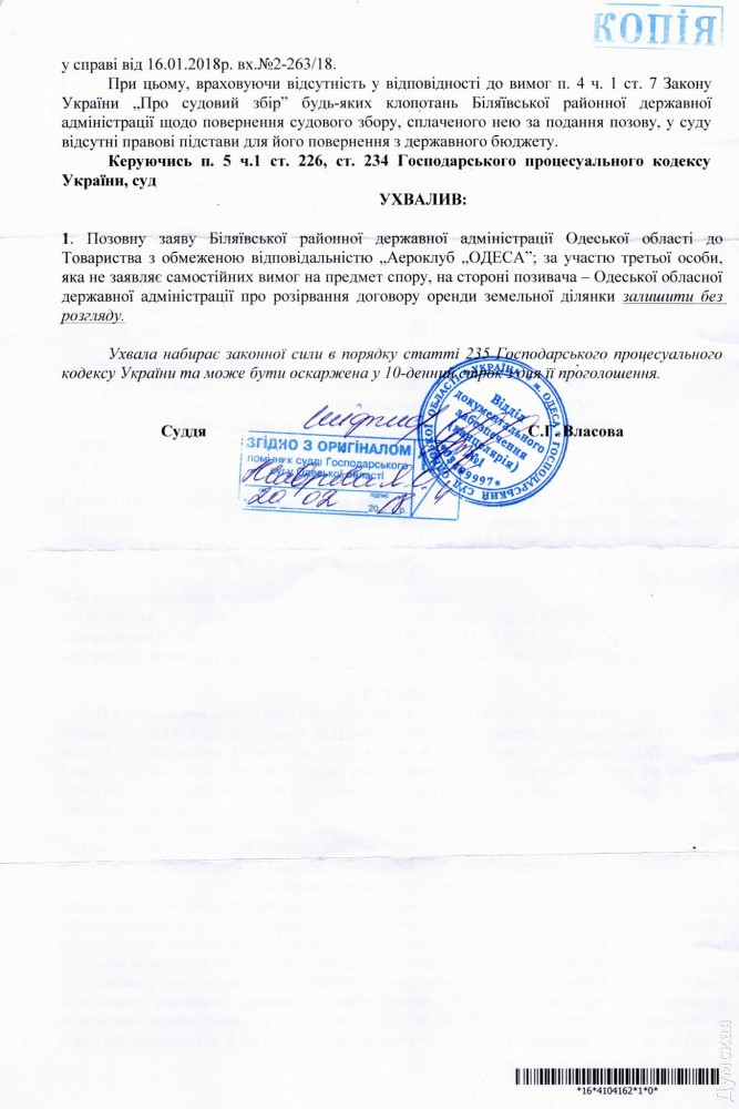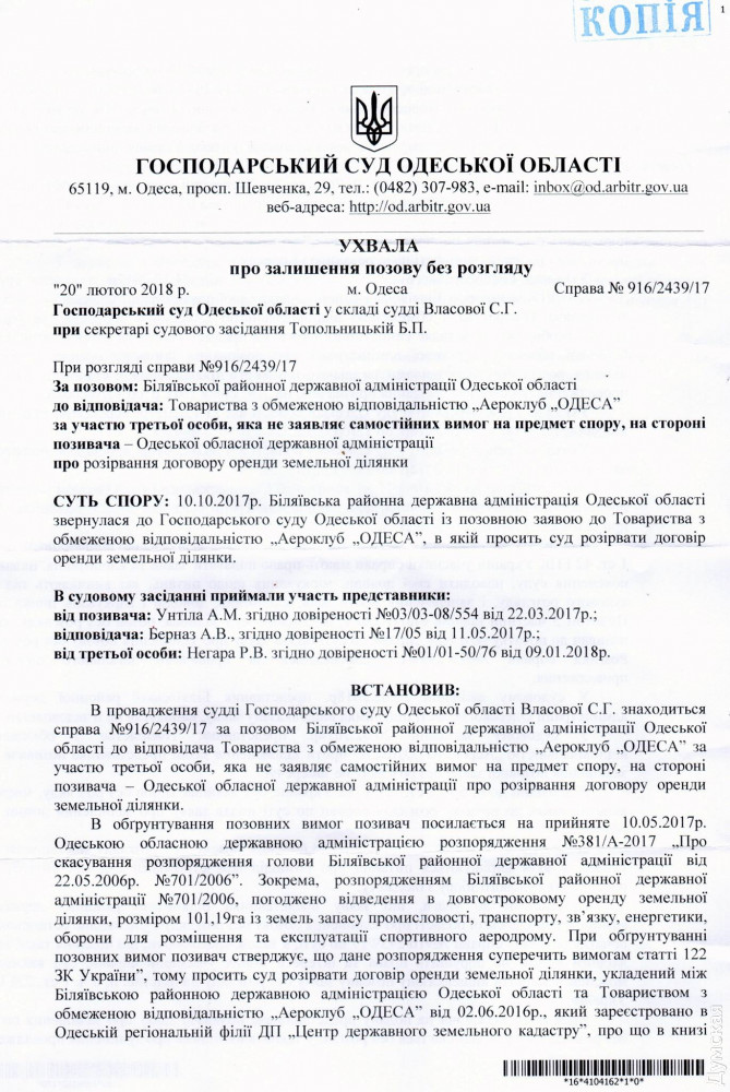 Хозяйственный суд Одесской области 20 февраля 2018 года на своем заседании рассмотрел дело по иску Беляевской районной госадминистрации Одесской области при участии Одесской областной государственной администрации о расторжении договора аренды земли с ООО «Аэроклуб «Одесса«. »Думская» не раз писала об этом деле. Предметом спора стали чуть более 101 гектара земли в Межлиманье, на которых расположен аэродром спортивной авиации «Гидропорт». Очередным витком спора вокруг лакомого участка стало распоряжение главы ОГА от 16 января 2018 об отмене распоряжения Беляевской райадминистрации от 2006 года о предоставлении аренды земли под аэродром. Руководство аэроклуба заявляет, что не понимает причину возникновения этого распоряжения, так как аэроклуб исправно платит аренду и все налоги. Совладелец аэроклуба Константин Оборин считает, что «кто-то из Беляевской райадминистрации попросту положил глаз на огромный участок в Межлиманье, где можно понастроить дач, поэтому от спортивного аэродрома решили избавиться». Хозяйственный суд Одесской области постановил оставить без рассмотрения исковое заявление Беляевской райадминистрации о расторжении договора аренды земли с ООО «Аэроклуб «Одесса». Напомним, на аэродроме базируется два десятка самолетов, которые регулярно участвуют в авиашоу в разных уголках области и страны. Одесские летчики-любители уже много лет составляют основу сборной Украины на международных состязаниях по высшему пилотажу и регулярно становятся призерами соревнований. А совсем недавно известный одесский летчик Валерий Наливайко стал председателем украинской Федерации самолетного спорта. СМЕРТЬ РОСІЙСЬКИМ ОКУПАНТАМ! Помітили помилку? Виділяйте слова з помилкою та натискайте control-enter |