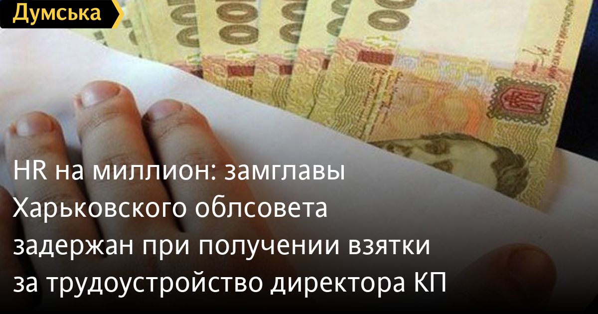 HR на миллион: замглавы Харьковского облсовета задержан при получении взятки за трудоустройство директора КПЗаместитель председателя Харьковского облсовета и его адвокат задержаны при получении взятки сотрудниками НАБУ и САП. Как сообщает пресс-служба Национального антикоррупционного бюро, подельников словили в момент получения последнего транша в размере 350 тыс. гривен. Общая сумма взятки составила 1 млн 50 тыс. гривен. «Деньги требовали от директора коммунального предприятия за то, чтобы он оставался на должности, — сообщают в НАБУ. Правоохранители готовятся сообщить задержанным о подозрении, проверяют информации о совершении ими других преступлений. Детали обещают озвучить позднее. СМЕРТЬ РОССИЙСКИМ ОККУПАНТАМ! Заметили ошибку? Выделяйте слова с ошибкой и нажимайте control-enter |