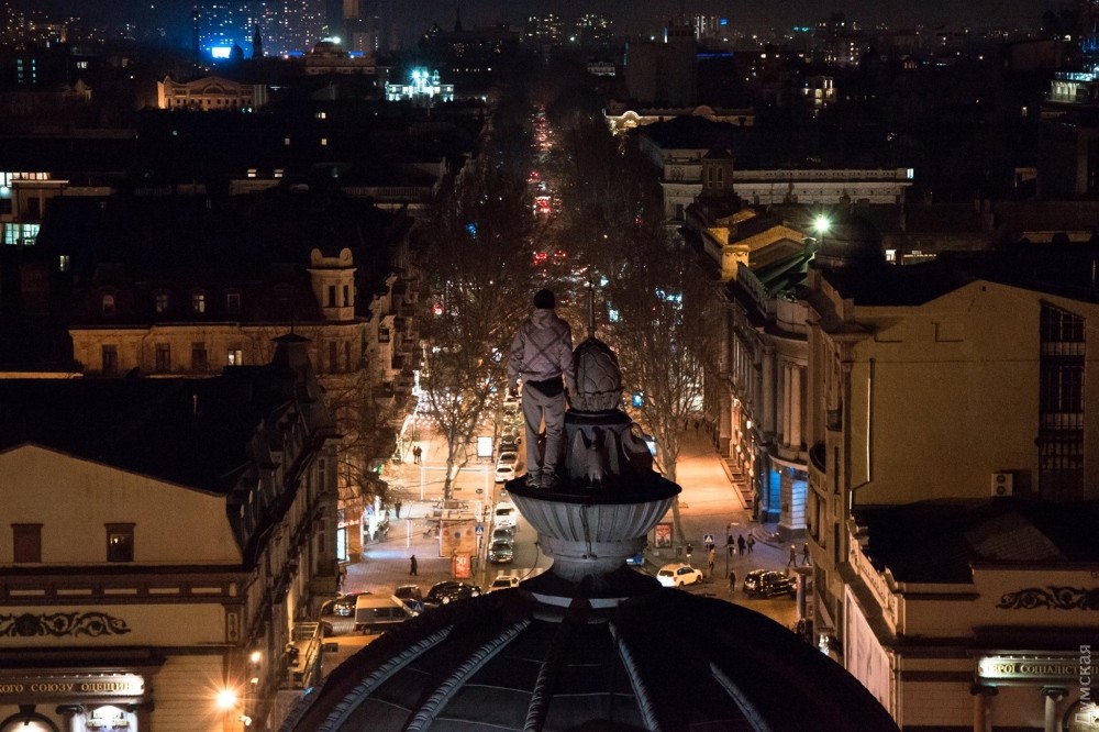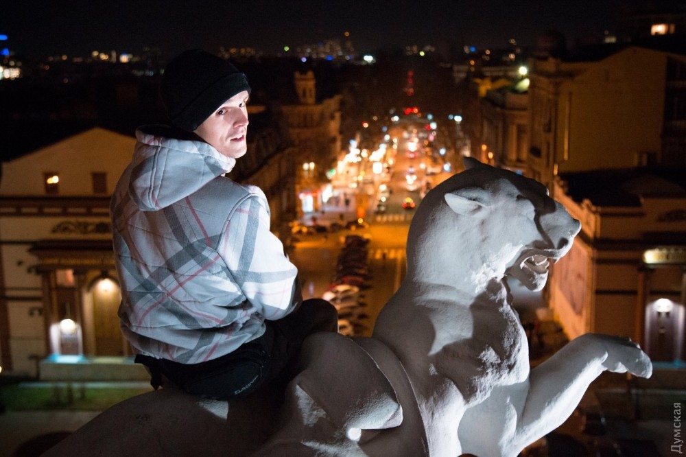 Одесский экстремал Евгений Лата вместе со своим киевским коллегой – Мустангом, известным своим патриотическим хулиганством, тайком взобрались на крышу Одесского оперного театра. «Когда приезжает Мустанг в Одессу, то жить становится чуточку экстремальнее. Залезли в самый час пик на Оперный театр. Охранники, как обычно, смотрели сериалы», — рассказал о приключении Евгений Лата на своей странице в Фейсбуке.