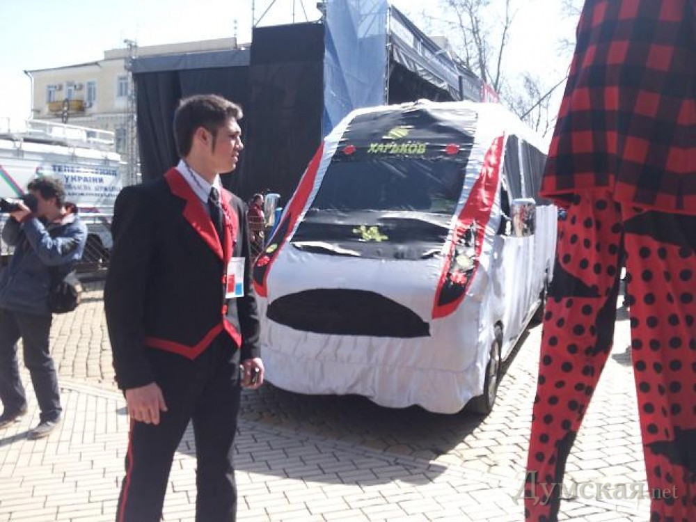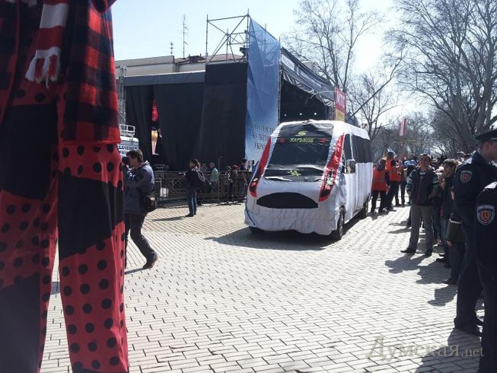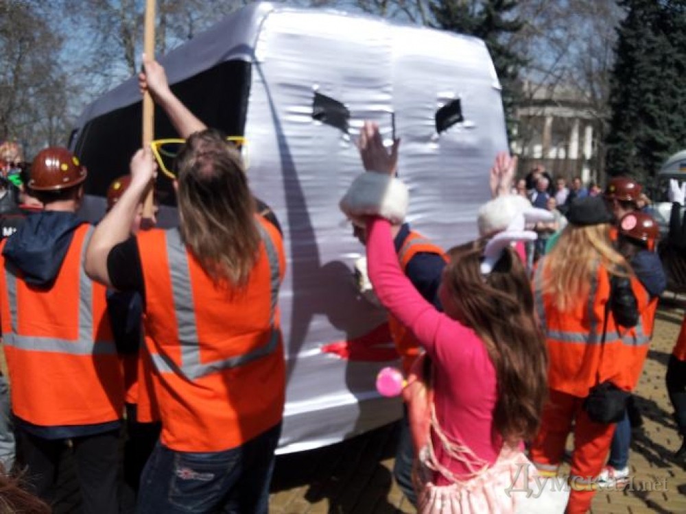 Шуточный макет поезда «Хюндай» проехался по центральным улицам Одессы в первоапрельской колонне. Как передает корреспондент «Думской», «состав» имени экс-вице-премьера Колесникова привезли с собой участники карнавала из Харькова. Горе-поезд сопровождала бригада ремонтников в оранжевых робах, которые уже собаку съели на устранении поломок.