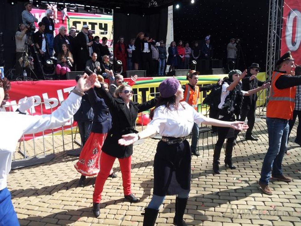 «Хюндай» «сломался» прямо перед сценой, установленной на Думской площади, и рабочие тут же починили вагон, танцуя вокруг него с инструментами.