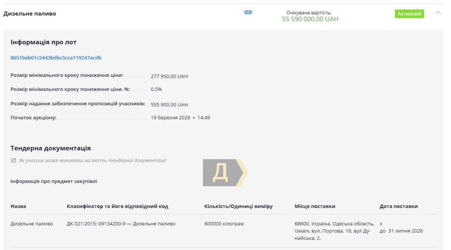 Как передает корреспондент «Думской», всего оно хочет приобрести 600 тысяч килограмм солярки с ожидаемой стоимостью 55,6 млн грн.